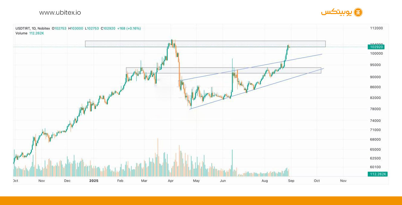 بهطور کلی، نمودار نشان میدهد که بازار در محدودهای حساس قرار دارد؛ جایی که هم امکان اصلاح تا سطوح حمایتی پایینتر وجود دارد و هم در صورت عبور از مقاومت کلیدی ۱۰۶,۰۰۰، مسیر برای ادامه روند صعودی هموار خواهد شد. از طرف دیگر، شرایط اقتصادی و سیاسی داخل کشور ــ از بورس و پیشفروشها گرفته تا تحولات سیاسی و دیپلماتیک ــ نقش تعیینکنندهای در نوسانات دلار و تتر خواهند داشت. بنابراین مدیریت ریسک و توجه همزمان به تحلیل تکنیکال و بنیادی، برای تصمیمگیری در این مقطع ضروری است.