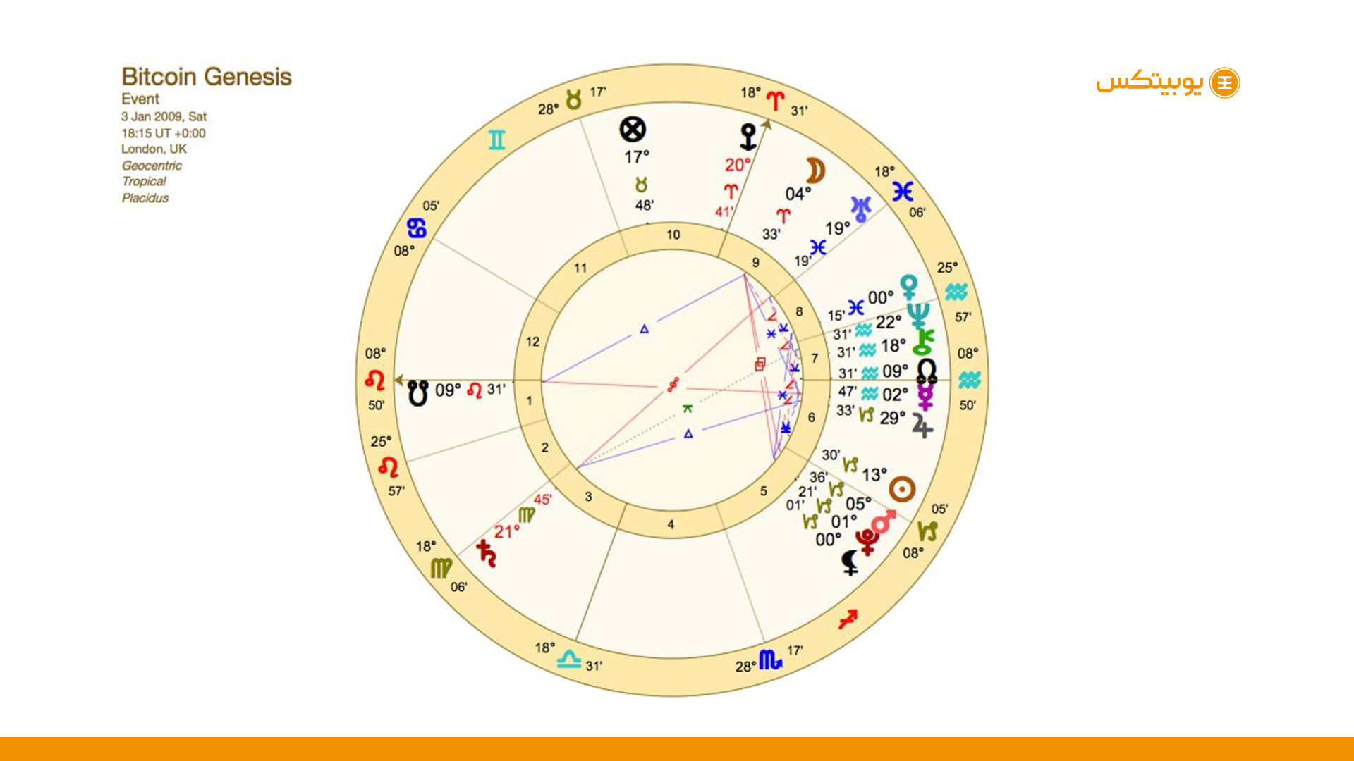 طالعبینان مالی معمولاً برای هر دارایی یک نمودار تولد تعریف میکنند؛ مثلاً برای بیتکوین، تاریخ پیدایش بلاک جنسیس (۳ ژانویه ۲۰۰۹) بهعنوان زمان تولد در نظر گرفته میشود. سپس موقعیت سیارات، ماه و سایر اجرام آسمانی در همان لحظه ثبت میشود.