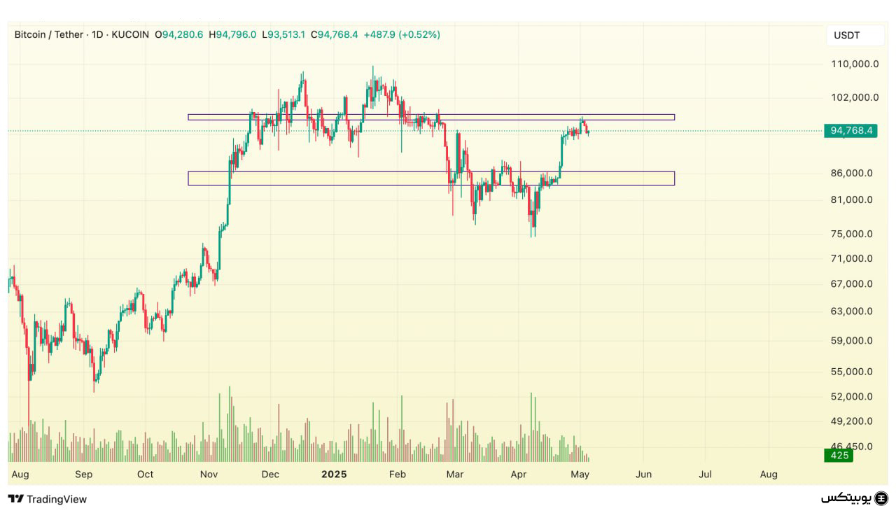 بیتکوین: محدوده مقاومتی بیتکوین بین ۹۷,۱۰۰ تا ۹۸,۳۵۰ دلار قرار دارد. ناحیه حمایتی نیز در بازه ۸۳,۸۰۰ تا ۸۶,۵۰۰ دلار تعریف میشود. تثبیت کندل روزانه بالای مقاومت میتواند نشانهای از تغییر روند باشد.