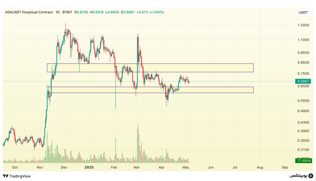 کاردانو: محدوده حمایتی کاردانو در بازه ۰.۶ تا ۰.۶۴ دلار قرار دارد. ناحیه مقاومتی آن نیز بین ۰.۷۶ تا ۰.۸۳ دلار تعریف شده است. این سطوح میتوانند به عنوان معیارهای کلیدی برای تحلیل رفتار قیمت استفاده شوند.