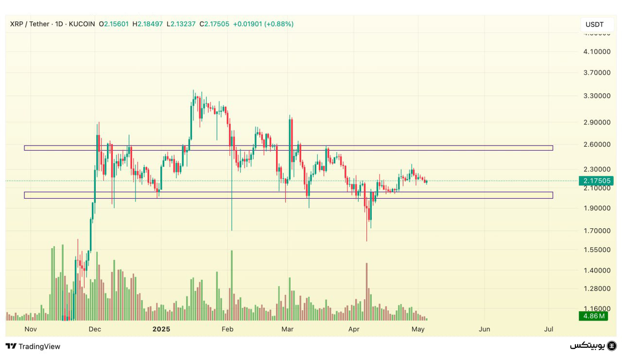 ریپل: محدوده حمایتی ریپل در بازه ۱.۹۹ تا ۲.۰۵ دلار قرار دارد. همچنین، ناحیه مقاومتی آن بین ۲.۵ تا ۲.۶ دلار مشخص شده است. این سطوح میتوانند نقاط مهمی برای جهتدهی به تصمیمات معاملاتی باشند.