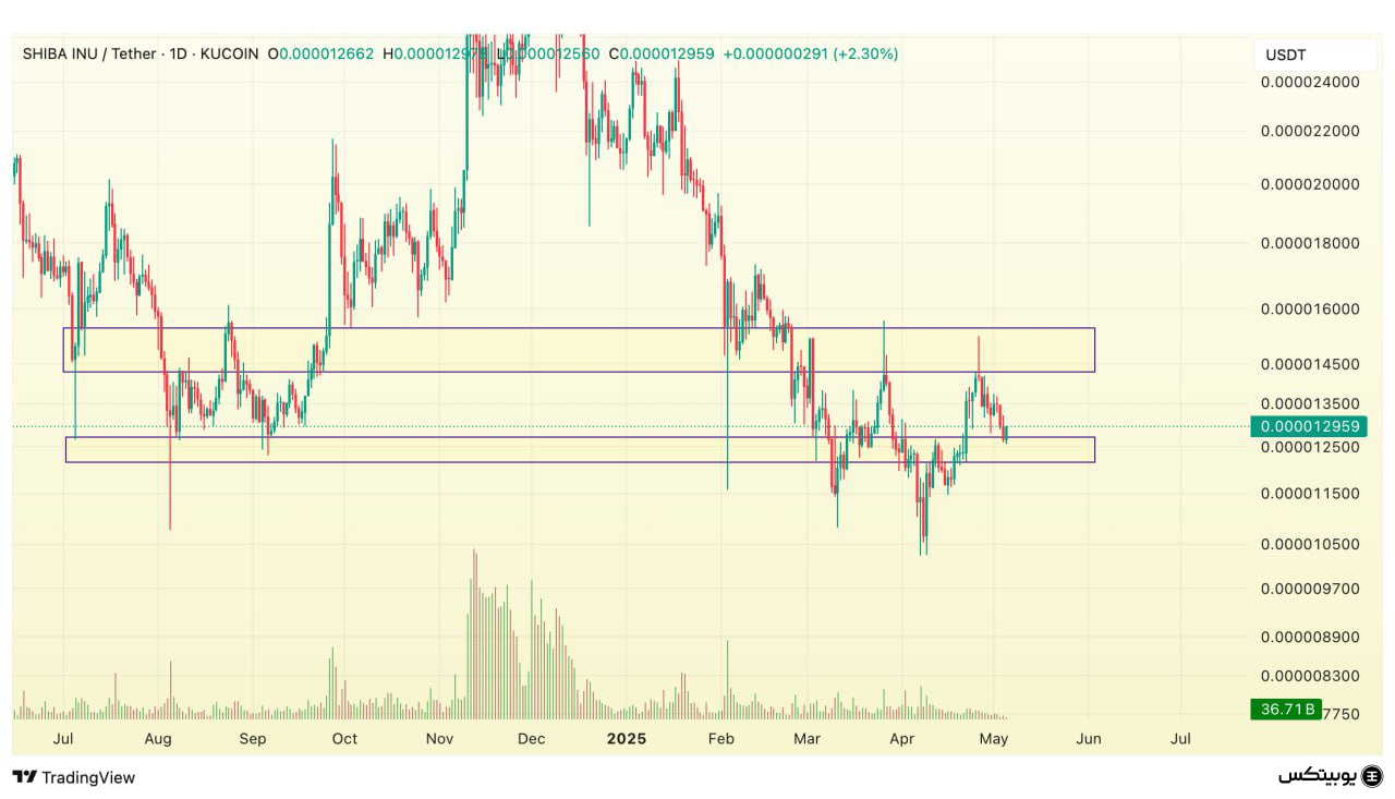 شیبا: برای شیبا، ناحیه حمایتی بین ۰.۰۰۰۰۱۲ تا ۰.۰۰۰۰۱۲۷ دلار تعریف شده است. همچنین، محدوده مقاومتی آن در بازه ۰.۰۰۰۰۱۴۳ تا ۰.۰۰۰۰۱۵۴ دلار قرار دارد. این سطوح میتوانند نشانههایی از جهتگیریهای آینده قیمت باشند.