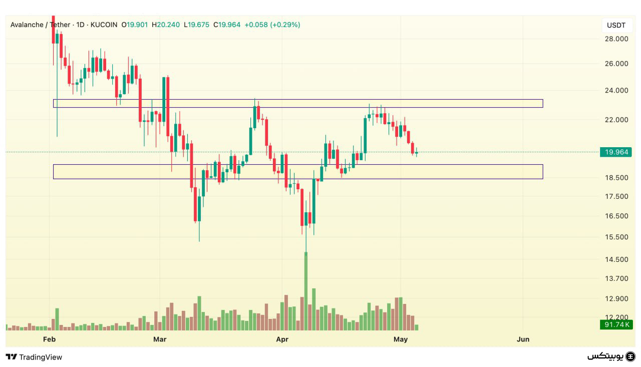 آواکس: محدوده حمایتی آواکس در بازه ۱۸.۴ تا ۱۹.۲ دلار قرار دارد. ناحیه مقاومتی آن نیز بین ۲۲.۸ تا ۲۳.۴ دلار مشخص شده است. این سطوح میتوانند نقاط مهمی برای تحلیل حرکت قیمت باشند.
