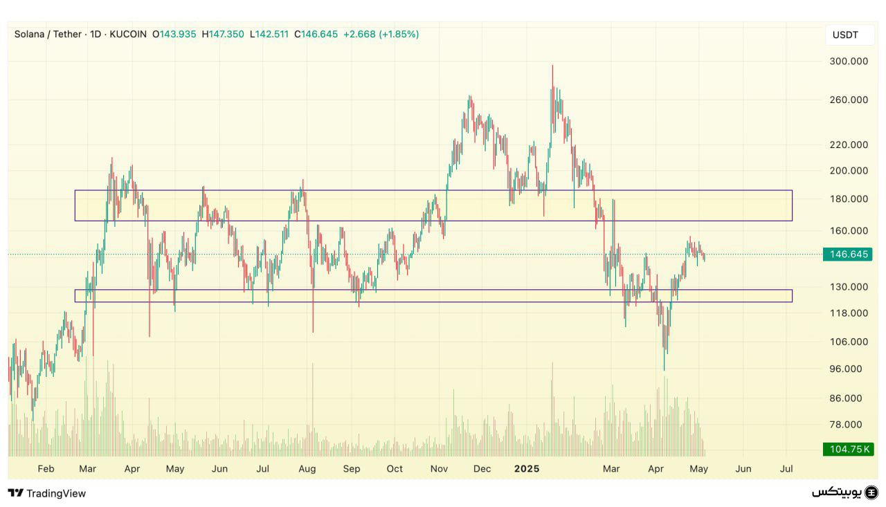 سولانا: محدوده حمایتی سولانا در بازه ۱۲۳ تا ۱۲۸ دلار قرار گرفته است. مقاومت مهم آن نیز بین ۱۶۵ تا ۱۸۵ دلار تعیین شده. این سطوح میتوانند مرزهای واکنش قیمت در حرکات آتی باشند.