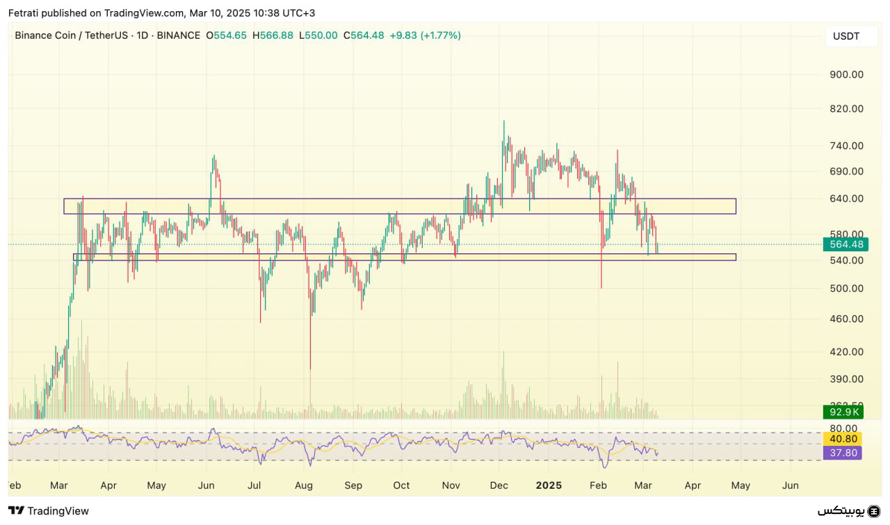 بایننس کوین در حال حاضر با مقاومتی در ناحیه ۶۱۰ تا ۶۴۰ دلار روبرو است که در صورت عبور از این سطح، احتمال رشد بیشتر قیمت وجود خواهد داشت. حمایت اصلی این ارز در محدوده ۵۴۰ تا ۵۵۰ دلار قرار دارد و در صورت از دست رفتن این سطح، امکان اصلاح قیمت به سمت محدوده ۵۰۰ دلار وجود خواهد داشت.