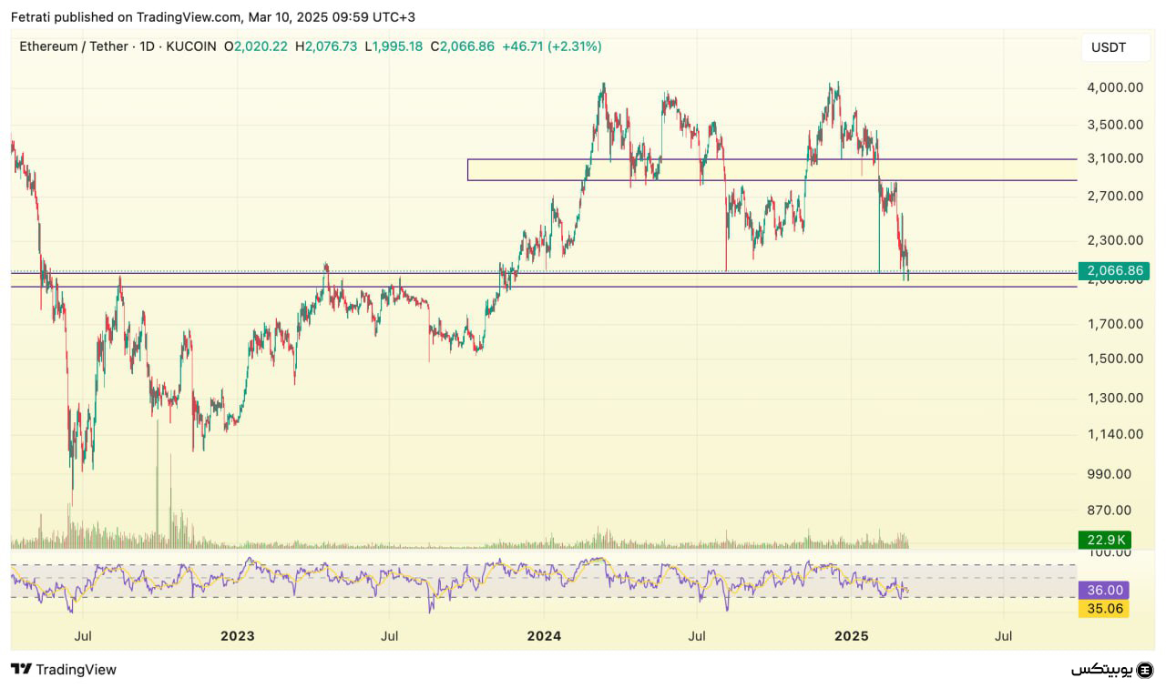 اتریوم در حال حاضر محدوده مقاومتی خود را در سطح ۲۲۰۰ دلار دارد. در صورتی که این مقاومت شکسته شود، احتمال رشد قیمت تا محدوده ۲۶۰۰ تا ۲۸۰۰ دلار وجود دارد. همچنین، محدوده حمایتی فعلی اتریوم در ناحیه ۱۹۵۰ تا ۲۰۵۰ دلار قرار دارد و در صورت از دست رفتن این سطح، میتوان انتظار کاهش قیمت تا محدوده ۱۶۰۰ دلار را داشت.