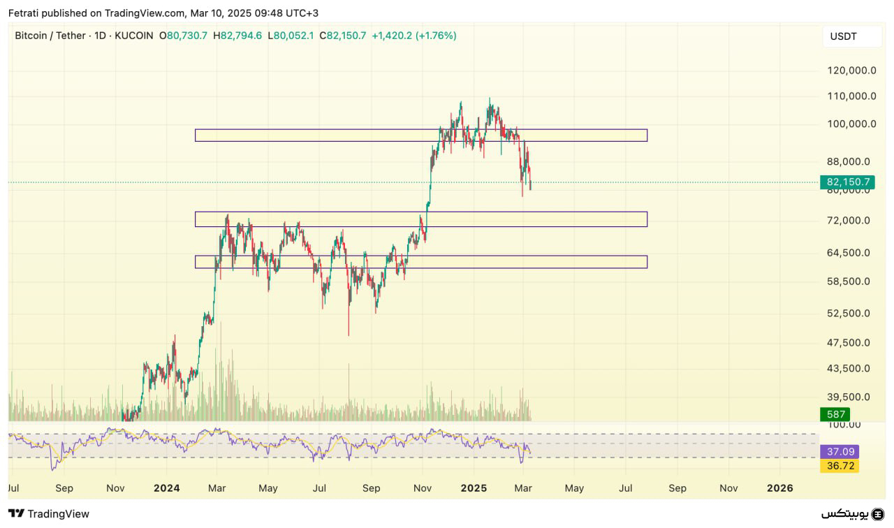 بیتکوین محدوده مقاومتی خود را در بازه ۹۵ هزار تا ۹۸ هزار دلار دارد. همچنین، محدوده حمایتی این ارز در ناحیه ۷۰ هزار تا ۷۴.۵ هزار دلار قرار دارد که در صورت رسیدن به آن، ممکن است شاهد برگشت قیمتی کوتاهمدت باشیم. در صورتی که این ناحیه حمایتی از دست برود، امکان کاهش قیمت تا محدوده ۶۱.۵ هزار تا ۶۴ هزار دلار وجود خواهد داشت.