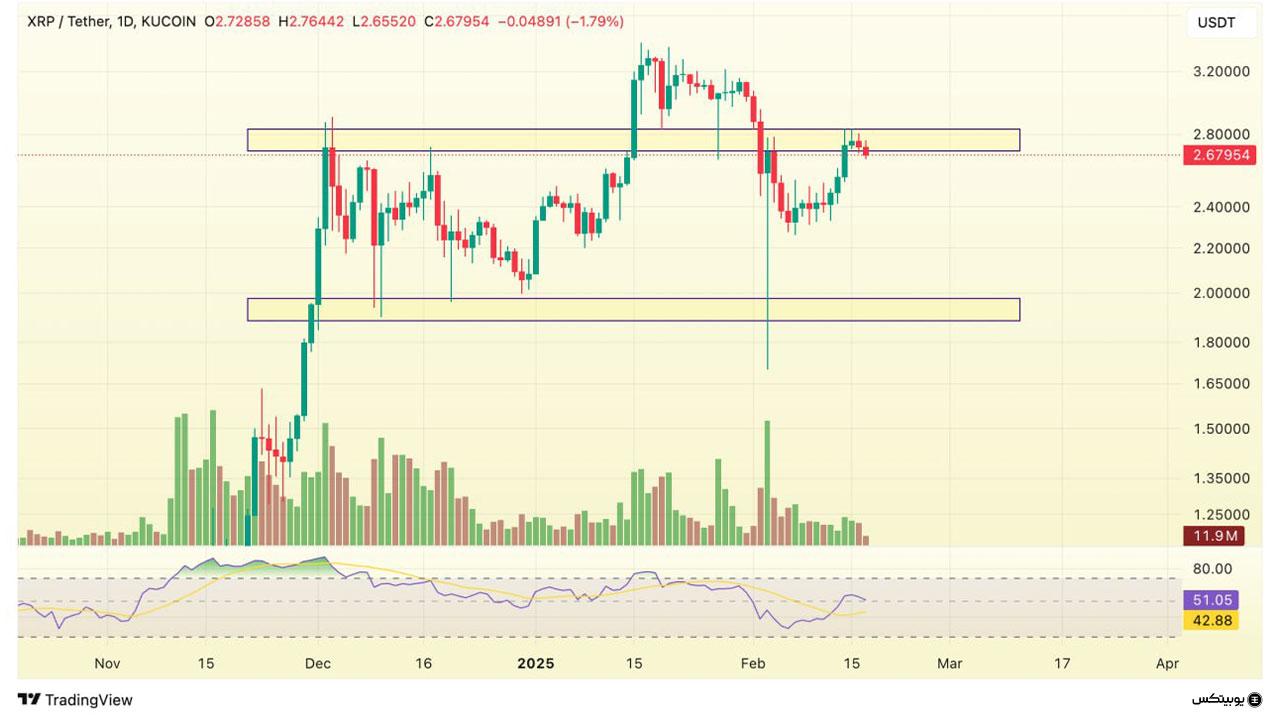 محدوده حمایتی ریپل ۱.۸ تا ۲ دلار قرار دارد و این سطح میتواند از کاهش بیشتر قیمت جلوگیری کند. در صورت حرکت صعودی، مقاومت در محدوده ۲.۷ تا ۲.۸۵ دلار میتواند چالشساز باشد.