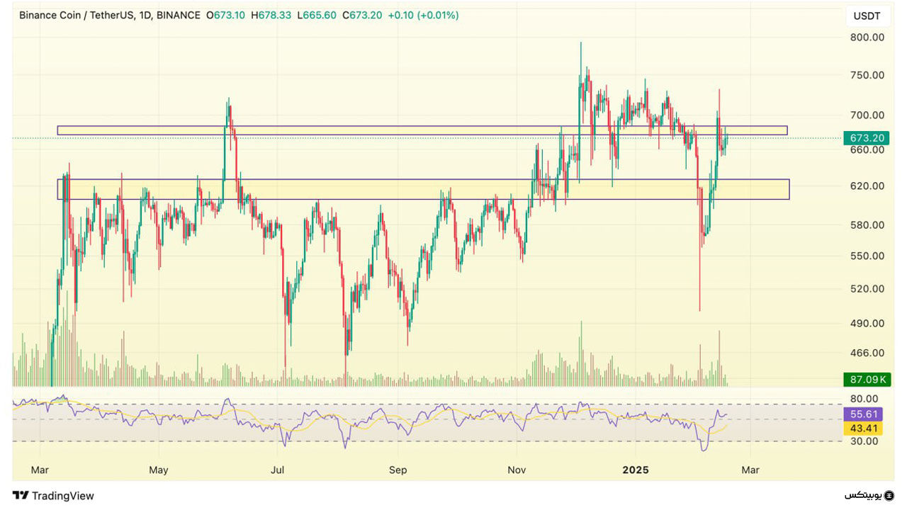 محدوده حمایتی بایننس کوین در ۶۰۰ تا ۶۲۵ دلار قرار دارد که میتواند از افت بیشتر قیمت جلوگیری کند. در صورت حرکت صعودی، قیمت ممکن است با مقاومت در محدوده ۶۷۵ تا ۶۸۵ دلار روبهرو شود