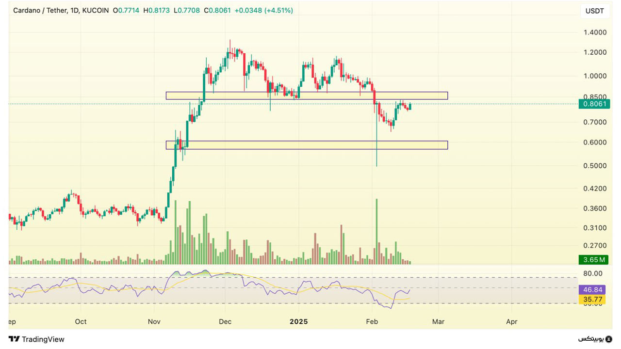 محدوده حمایتی کاردانو در ۰.۵۷ تا ۰.۶ دلار قرار دارد و این سطح میتواند از کاهش بیشتر قیمت جلوگیری کند. در صورت رشد، قیمت ممکن است با مقاومت در محدوده ۰.۸۳ تا ۰.۸۸ دلار روبهرو شود.
