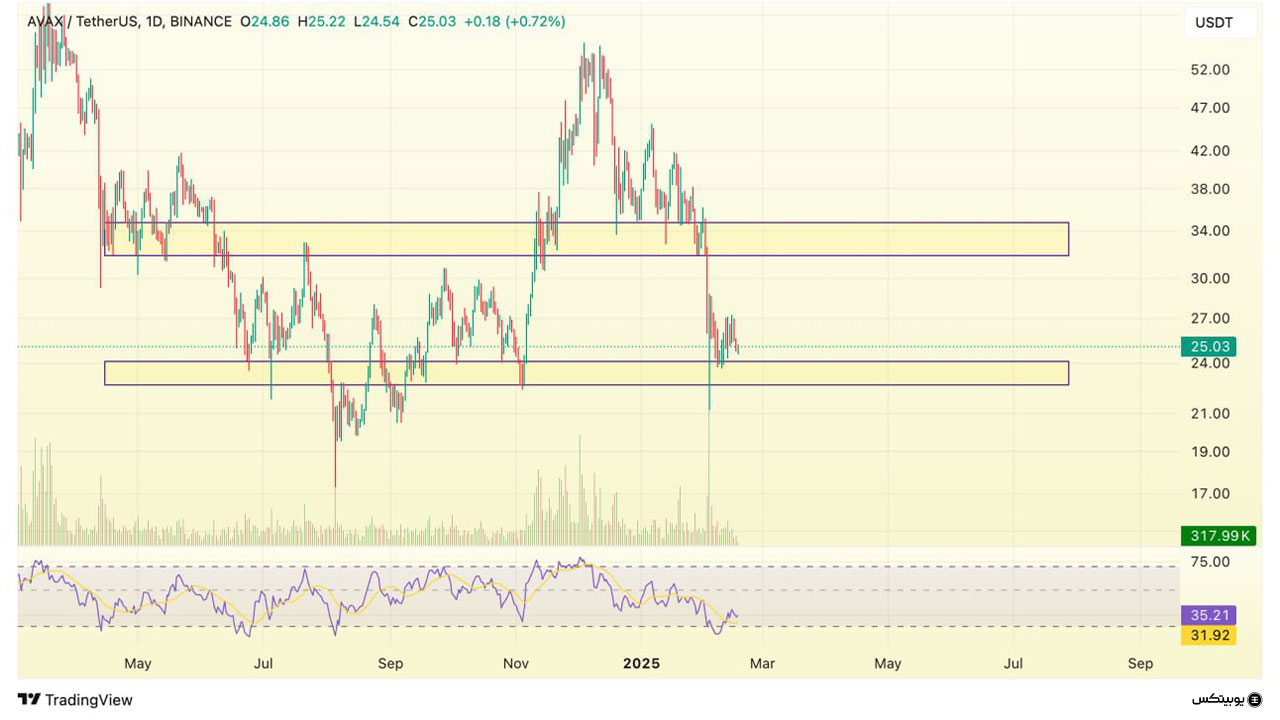 محدوده حمایتی آواکس در ۲۲.۵ تا ۲۴ دلار قرار دارد و این سطح میتواند از کاهش بیشتر قیمت جلوگیری کند. در صورت رشد، قیمت ممکن است با مقاومت در محدوده ۳۱ تا ۳۴ دلار روبهرو شود.
