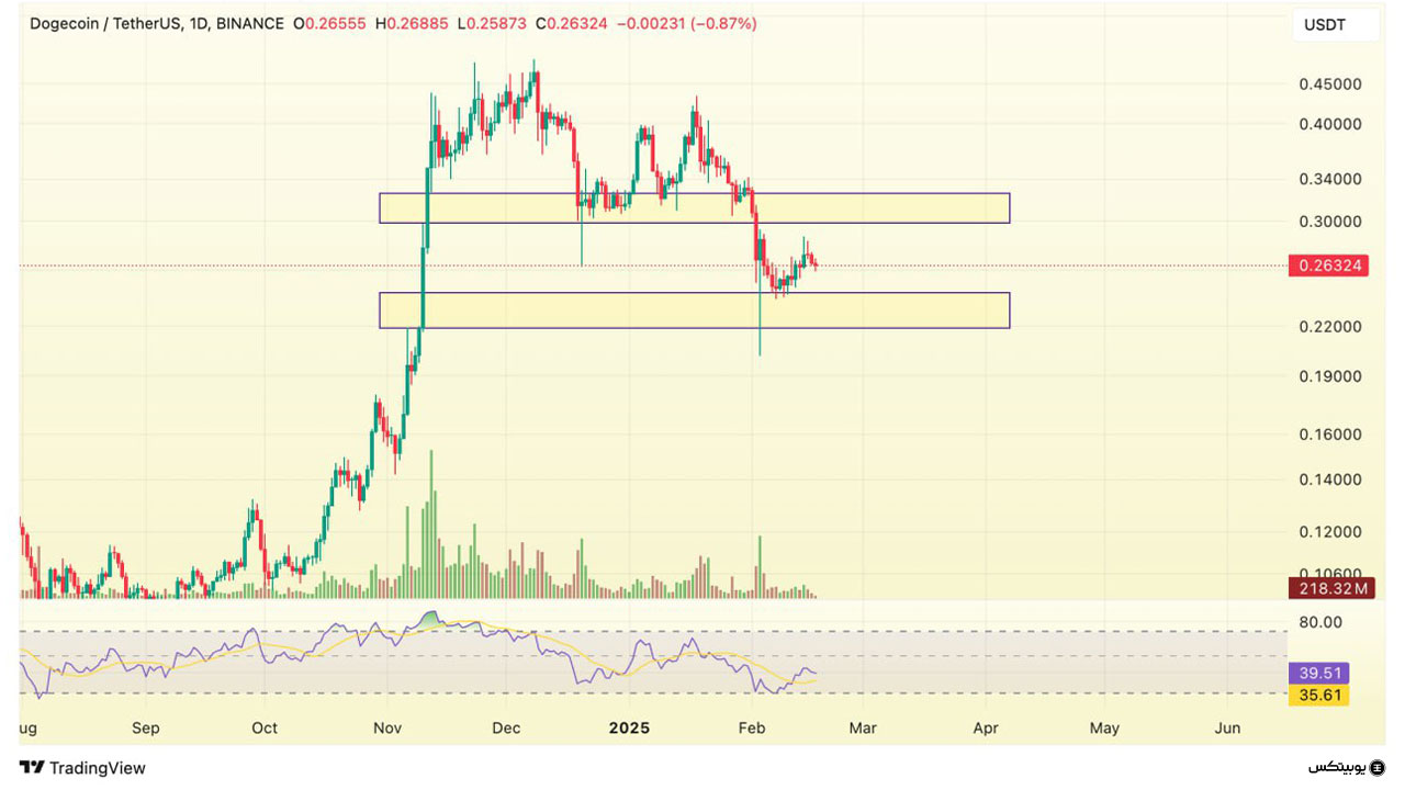محدوده حمایتی دوج کوین در ۰.۲۲ تا ۰.۲۴ دلار قرار دارد و این سطح میتواند از نزول بیشتر قیمت جلوگیری کند. در صورتی که روند صعودی ادامه یابد، مقاومت در بازه ۰.۳۰ تا ۰.۳۲ دلار ممکن است مانع از ادامه رشد شود.