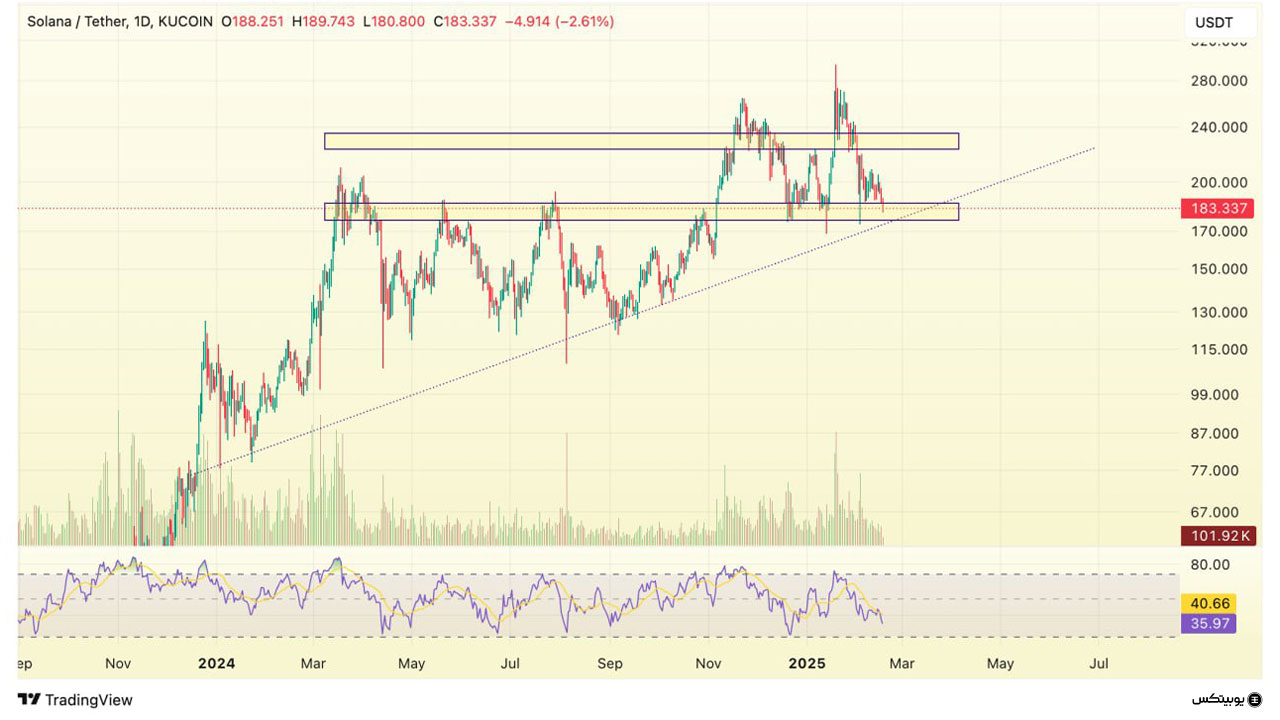 محدوده حمایتی سولانا در ۱۷۵ تا ۱۸۵ دلار قرار دارد و حفظ این سطح برای جلوگیری از افت بیشتر ضروری است. در صورت صعود، مقاومت در محدوده ۲۲۵ تا ۲۳۰ دلار میتواند مانع از ادامه رشد شود.