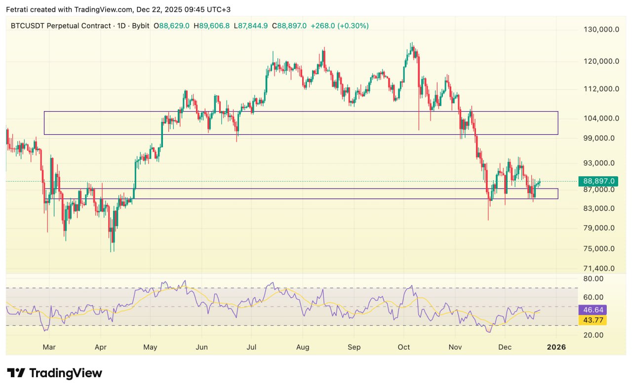 بیتکوین در محدودهی حمایتی ۸۵٬۰۰۰ تا ۸۷٬۳۰۰ در حال تثبیت است و حفظ این ناحیه میتواند مانع ادامهی ریزش و زمینهساز نوسان روبهبالا شود. مقاومت سنگین ۱۰۰٬۰۰۰ تا ۱۰۶٬۰۰۰ همچنان سقف اصلی بازار است و شکست آن جهت حرکت بعدی قیمت بیت کوین را مشخص خواهد کرد.