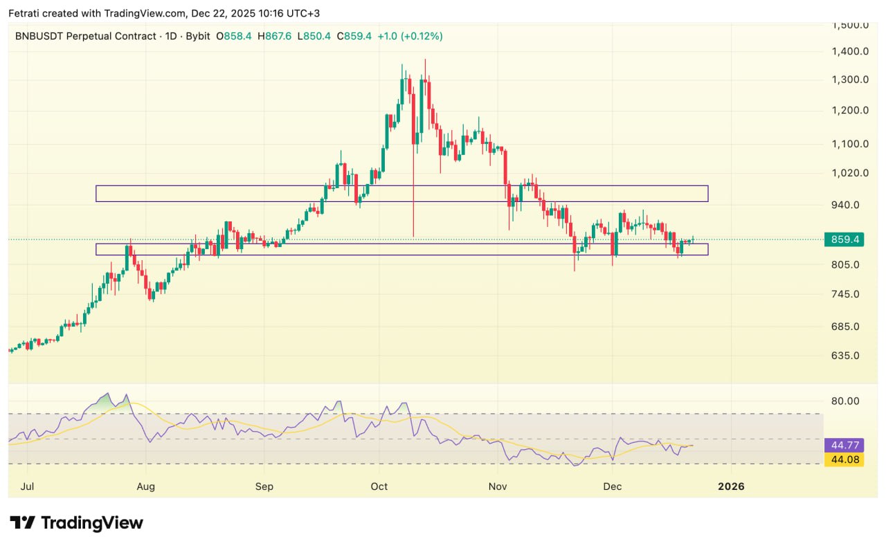 بی ان بی در محدودهی حمایتی ۸۲۵ تا ۸۵۰ در حال نوسان است و حفظ این زون میتواند زمینهی تثبیت و اصلاح زمانی بازار را فراهم کند. مقاومت ۹۵۰ تا ۹۹۰ سقف مهم کوتاهمدت محسوب میشود و عبور و تثبیت بالای آن نشانهی بازگشت مومنتوم صعودی خواهد بود.