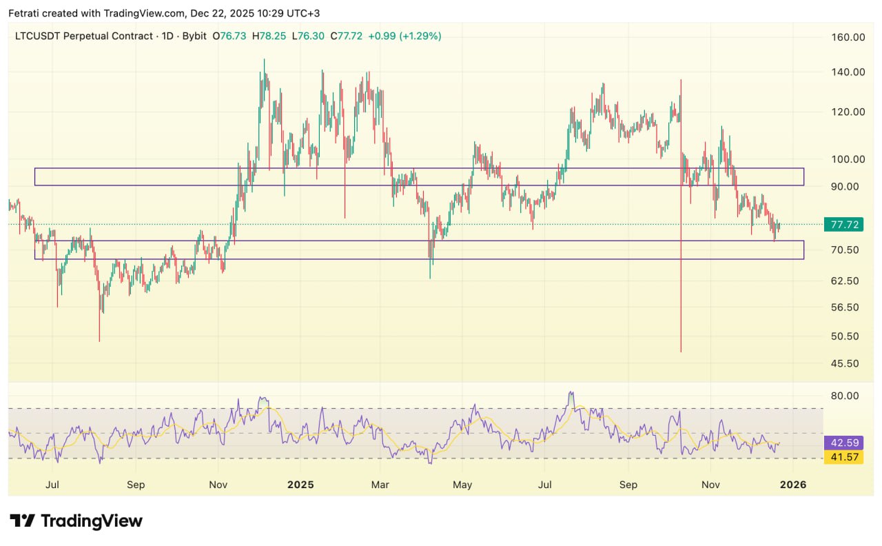 قیمت LTC در نزدیکی محدوده حمایتی ۶۸ تا ۷۳ نوسان میکند و حفظ این ناحیه میتواند باعث تثبیت و شکلگیری برگشت کوتاهمدت شود. محدوده ۹۰ تا ۹۵ مقاومت مهم بازار است و عبور و تثبیت بالای آن میتواند نشانه آغاز موج صعودی بعدی باشد.