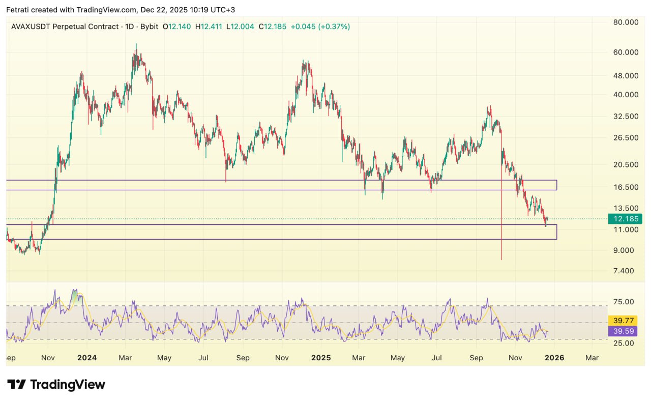 قیمت AVAX روی محدودهی حمایتی ۱۰ تا ۱۱.۵ در حال تثبیت است و حفظ این ناحیه میتواند زمینهی یک پولبک کوتاهمدت را فراهم کند. مقاومت ۱۶ تا ۱۷.۵ سد اصلی بازیابی قیمت آواکس است و عبور و تثبیت بالای آن نشانهی بازگشت مومنتوم صعودی خواهد بود.