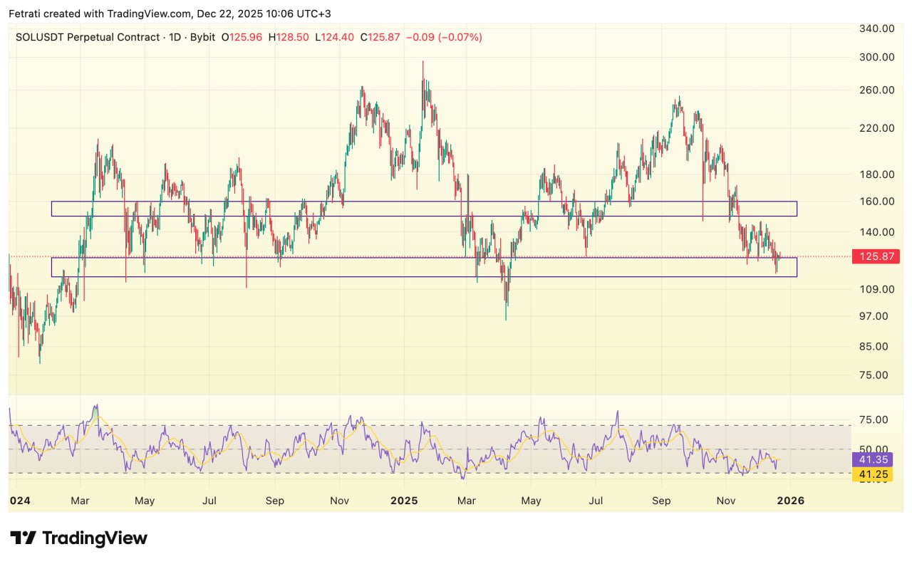 سولانا در محدودهی حمایتی ۱۱۵ تا ۱۲۵ در حال نوسان و تلاش برای تثبیت است و حفظ این ناحیه میتواند از ریزش عمیقتر جلوگیری کند. مقاومت مهم ۱۵۰ تا ۱۶۰ سد اصلی مسیر صعودی است و شکست آن نشانهی تغییر فاز بازار خواهد بود.
