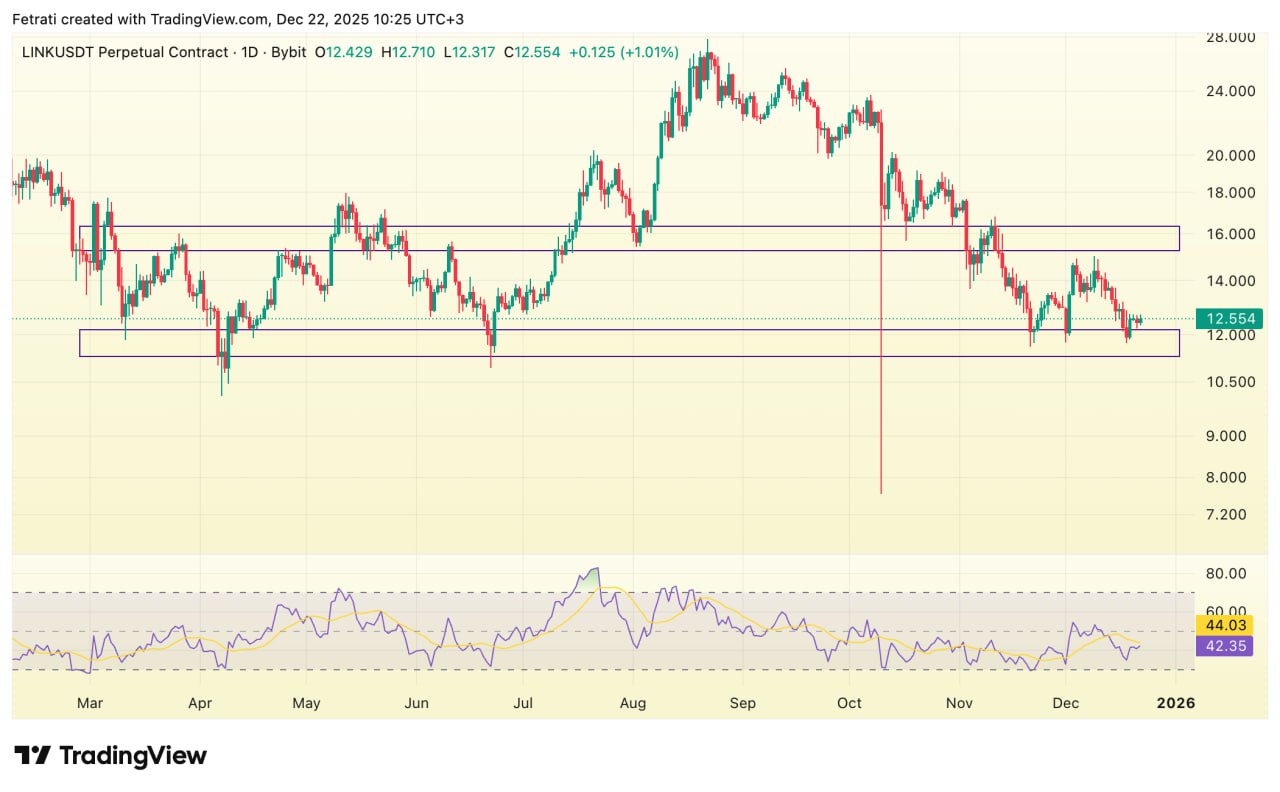 قیمت LINK در محدوده حمایتی ۱۱.۳ تا ۱۲.۲ در حال تثبیت است و حفظ این ناحیه میتواند منجر به نوسان خنثی رو به بالا شود. محدوده ۱۵.۲ تا ۱۶.۲ مقاومت کلیدی پیشِروست و عبور از آن نشانه شروع فاز بازیابی و تقویت مومنتوم صعودی خواهد بود.