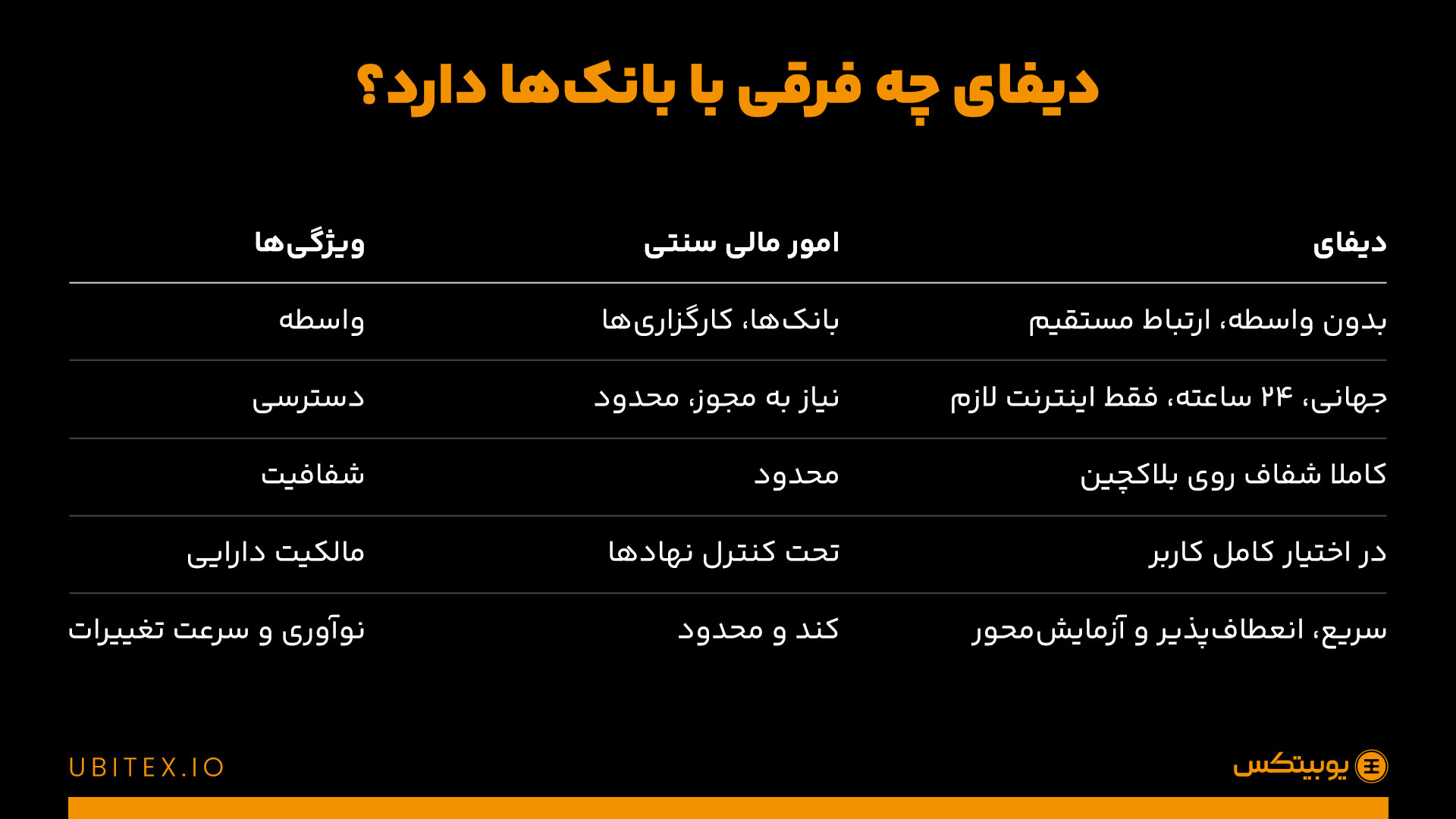 تلفن تماس: 91001716 - ساعت 9 الی 17در دنیای مالی سنتی، بانکها، مؤسسات اعتباری و واسطههای مالی حرف اول و آخر را میزنند. اما حالا پدیدهای به نام «دیفای» (DeFi) آمده که داستان امور مالی را طور دیگری تعریف می کند که در این پست از بلاگ یوبیتکس، به واکاوی آن خواهیم پرداخت. کلمه دیفای (DeFi) کوتاهشدهی عبارت Decentralized Finance به معنی "امور مالی غیرمتمرکز" هست. یعنی سیستمی که تلاش میکند خدمات مالی را بدون نیاز به واسطههایی مثل بانک، بهصورت مستقیم، شفاف و در دسترس همه ارائه دهد.