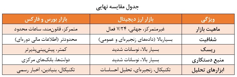 برای موفقیت در هرکدام از این بازارها، تحلیلگران باید ابزارها و استراتژیهای خود را با ویژگیهای منحصربهفرد آن بازار تنظیم کنند. ارز دیجیتال فرصتی نوظهور و پرریسک است، در حالی که بورس و فارکس انتخابی پایدارتر برای تحلیلگران سنتی محسوب میشوند.
