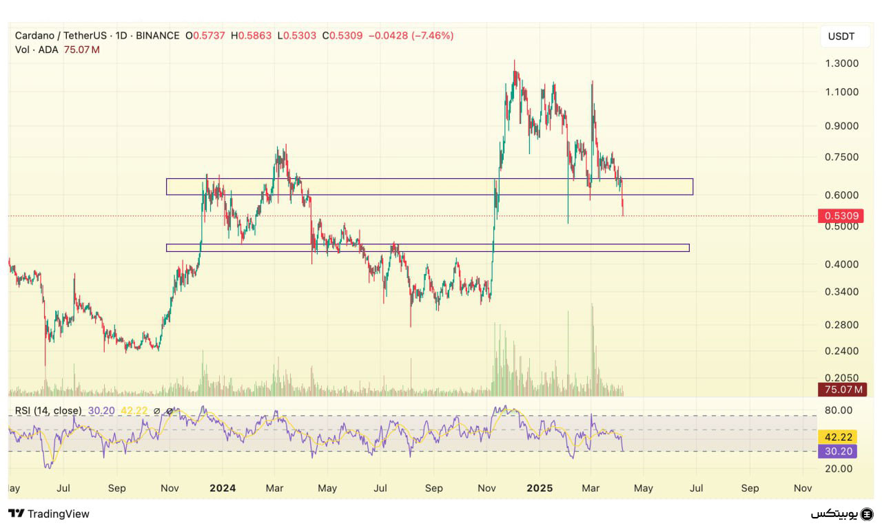 در تحلیل کلاسیک کاردانو، ناحیه ۰.۴۳ تا ۰.۴۵ دلار بهعنوان سطح حمایتی کلیدی شناخته میشود که میتواند مانع از ادامه روند نزولی گردد. در مقابل، مقاومت قوی در محدوده ۰.۶۰ تا ۰.۶۶ دلار قرار دارد که شکست آن برای ادامه حرکت صعودی ضروری خواهد بود.