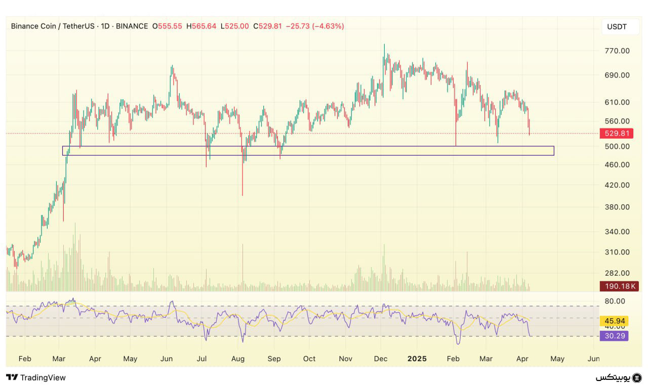 در تحلیل بایننس کوین، ناحیه ۴۸۰ تا ۵۰۰ دلار بهعنوان سطح حمایتی معتبر شناخته میشود که میتواند از کاهش بیشتر قیمت جلوگیری کند. در مقابل، محدوده مقاومتی ۵۴۰ تا ۵۶۰ دلار قرار دارد که عبور از آن برای ادامه روند صعودی ضروری خواهد بود.
