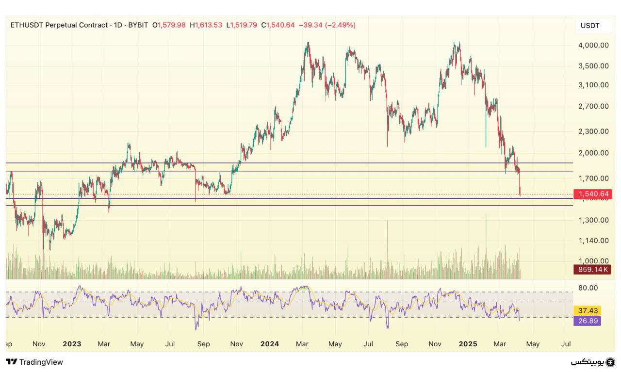 در نمودار اتریوم، محدوده قیمتی ۱۴۳۰ تا ۱۴۸۰ دلار بهعنوان حمایت کلیدی در نظر گرفته میشود و میتواند مانع افت بیشتر قیمت گردد. در سوی دیگر، سطوح ۱۷۵۰ تا ۱۸۵۰ دلار بهعنوان ناحیه مقاومتی عمل میکنند که شکست آنها، زمینهساز رشد بیشتر خواهد بود.
