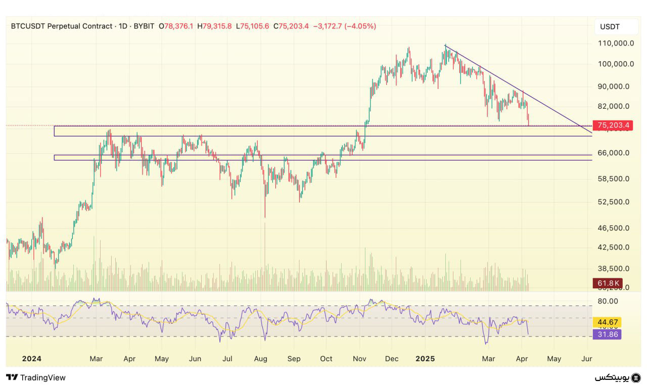 بیتکوین در محدوده قیمتی ۷۱۵۰۰ تا ۷۵۰۰۰ دلار دارای حمایت معتبر است که میتواند مانع از افت بیشتر قیمت شود. در مقابل، ناحیه ۸۳۰۰۰ تا ۸۶۰۰۰ دلار بهعنوان مقاومت اصلی عمل میکند و عبور از آن نیازمند قدرت بالای خریداران است.
