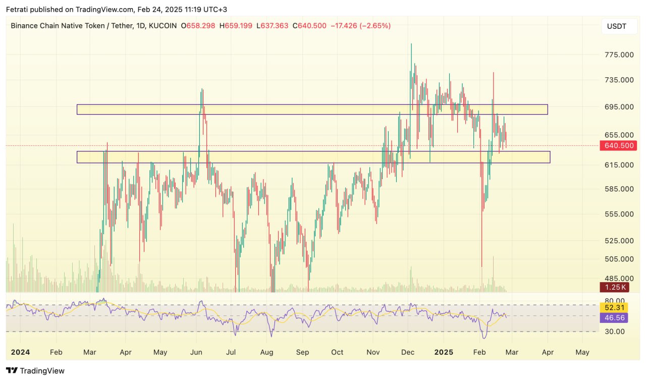 محدوده حمایتی بایننس کوین بین ۶۱۸ تا ۶۳۱ دلار قرار دارد و در صورت کاهش قیمت، این سطح میتواند نقش حمایتی ایفا کند. از سوی دیگر، محدوده مقاومتی آن بین ۶۸۵ تا ۷۰۰ دلار است که عبور از این سطح میتواند باعث ادامه رشد قیمت شود.