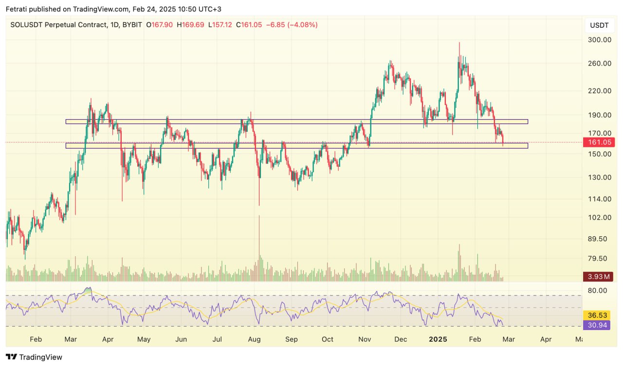 محدوده حمایتی سولانا بین ۱۵۵ تا ۱۶۰ دلار قرار دارد و در صورت کاهش قیمت، این سطح میتواند واکنشهایی به همراه داشته باشد. از طرف دیگر، محدوده مقاومتی آن بین ۱۸۰ تا ۱۸۵ دلار تعریف میشود که برای ادامه روند صعودی، شکست این سطح ضروری است.