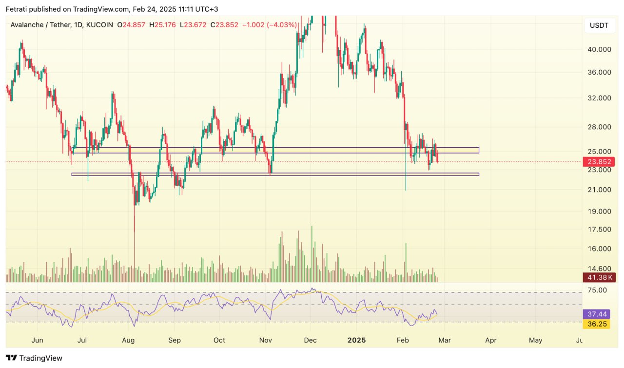 محدوده حمایتی آواکس بین ۲۲.۳ تا ۲۲.۶ دلار قرار دارد و میتواند از افت بیشتر قیمت جلوگیری کند. در مقابل، محدوده مقاومتی آن بین ۲۴ تا ۲۶ دلار است که عبور از این سطح میتواند روند صعودی را تقویت کند.