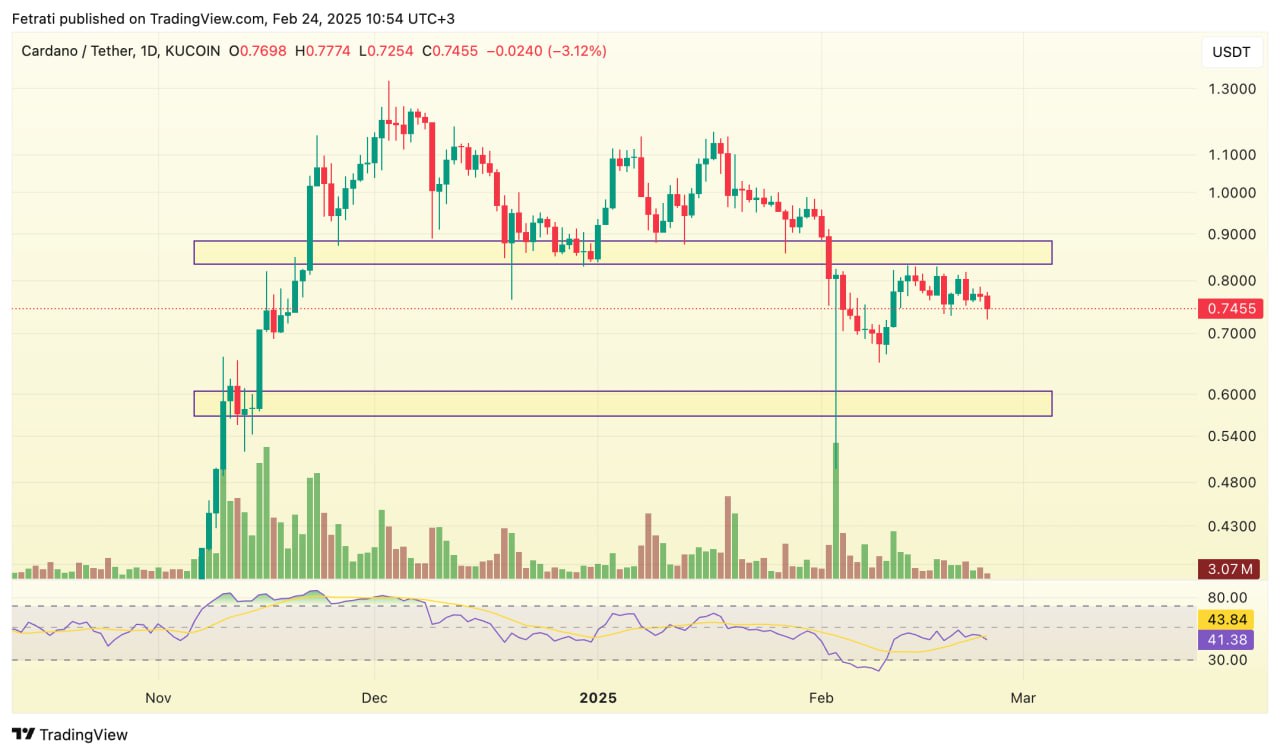 محدوده حمایتی کاردانو بین ۰.۵۵ تا ۰.۶ دلار قرار دارد و از این سطح میتوان انتظار حمایت قیمتی داشت. در سمت مقابل، محدوده مقاومتی آن بین ۰.۸۳ تا ۰.۸۸ دلار تعریف میشود که شکست آن میتواند روند صعودی را تقویت کند.