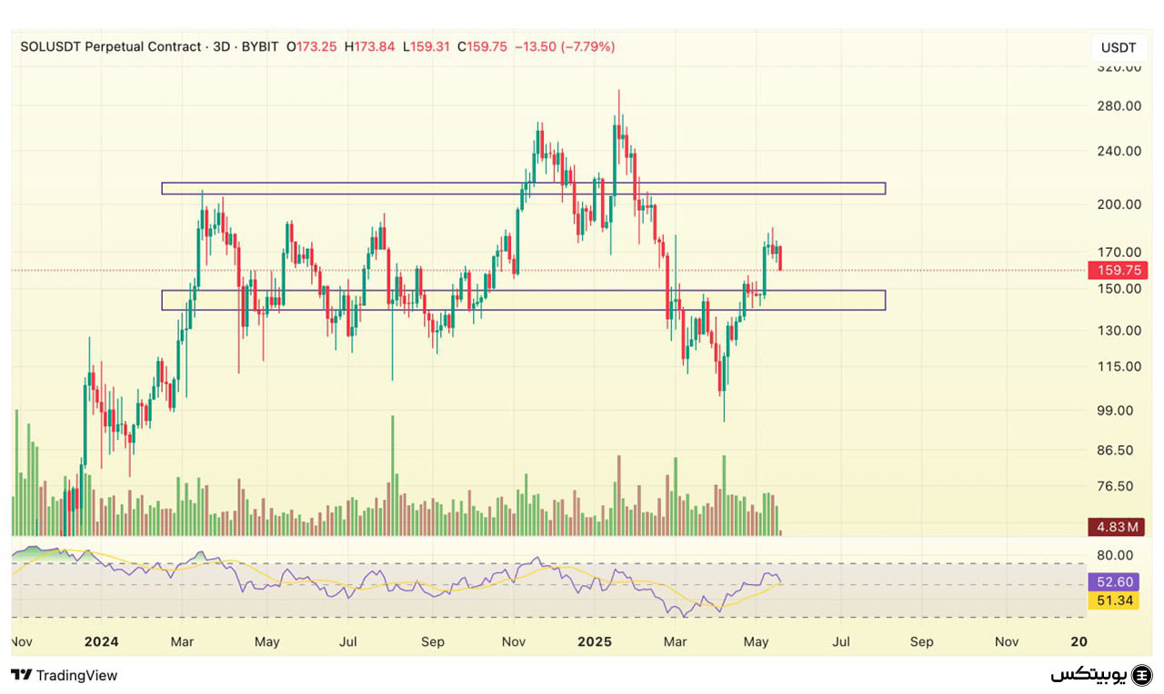 سولانا: سولانا در محدوده ۱۴۰ تا ۱۴۹ دلار دارای حمایت قوی است که ممکن است جلوی ریزش بیشتر را بگیرد. مقاومت مهم این رمزارز بین ۲۰۵ تا ۲۱۵ دلار قرار دارد و عبور از آن میتواند آغازگر یک حرکت صعودی جدید باشد.