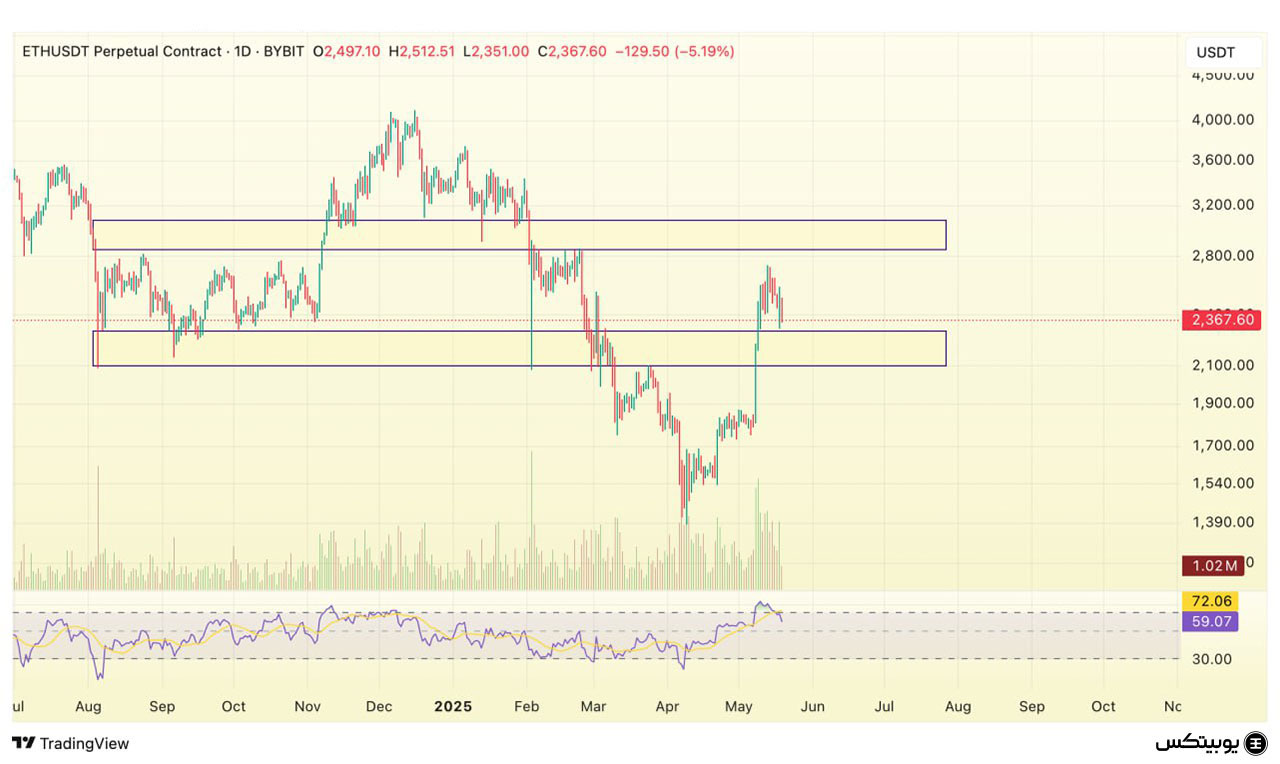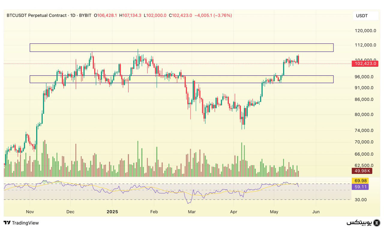 بیتکوین: بیتکوین در حال حاضر در ناحیه حمایتی ۹۳ تا ۹۷ هزار دلار حمایت میشود. در سمت مقابل، محدوده مقاومتی بین ۱۰۶ تا ۱۰۸ هزار دلار قرار دارد. در صورت عبور قیمت از این مقاومت، اولین هدف بعدی میتواند سطح ۱۱۲ هزار دلار باشد.