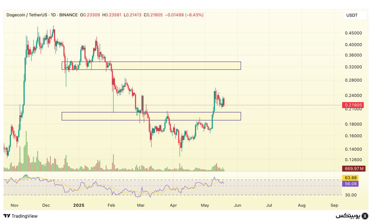 دوج کوین: دوج کوین در محدوده ۰.۱۹ تا ۰.۲ دلار حمایت دارد و در صورت حفظ این سطح، احتمال رشد بیشتر وجود دارد. مقاومت کلیدی آن بین ۰.۳ تا ۰.۳۳ دلار قرار دارد که عبور از آن میتواند مسیر حرکت به سطوح بالاتر را هموار کند.