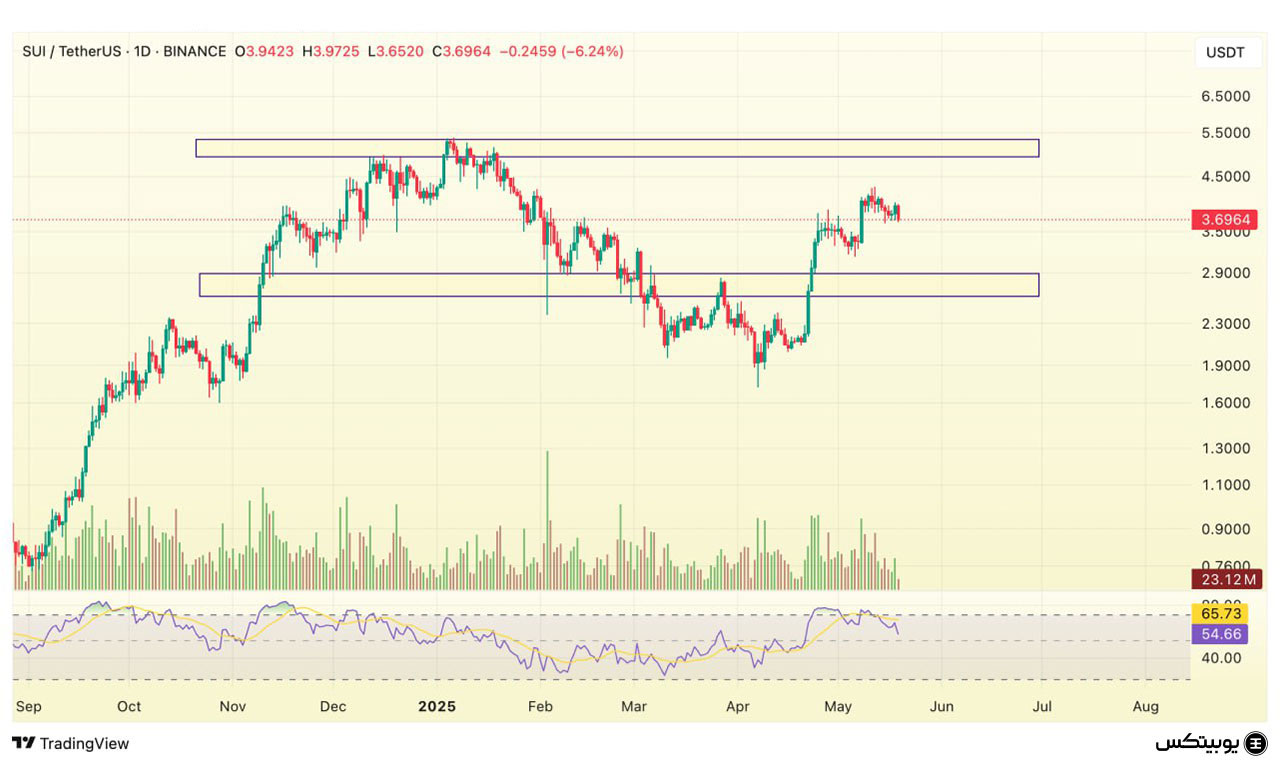 سویی: سویی در محدوده ۲.۵۶ تا ۲.۸۸ دلار حمایت دارد که میتواند مانع از افت بیشتر قیمت شود. محدوده مقاومتی آن نیز بین ۴.۹ تا ۵.۳ دلار قرار گرفته و عبور از این سطح میتواند ادامه روند صعودی را تقویت کند.
