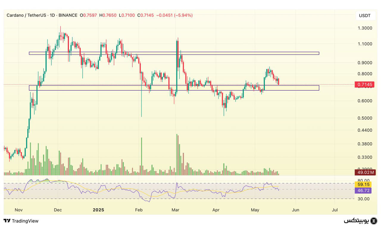کاردانو: کاردانو در محدوده ۰.۶۷ تا ۰.۷ دلار حمایت دارد و تثبیت قیمت در این ناحیه میتواند از افت بیشتر جلوگیری کند. در مسیر صعودی، مقاومت مهم بین ۰.۹۸ تا ۱ دلار قرار دارد که عبور از آن میتواند سیگنال ادامه روند صعودی باشد.