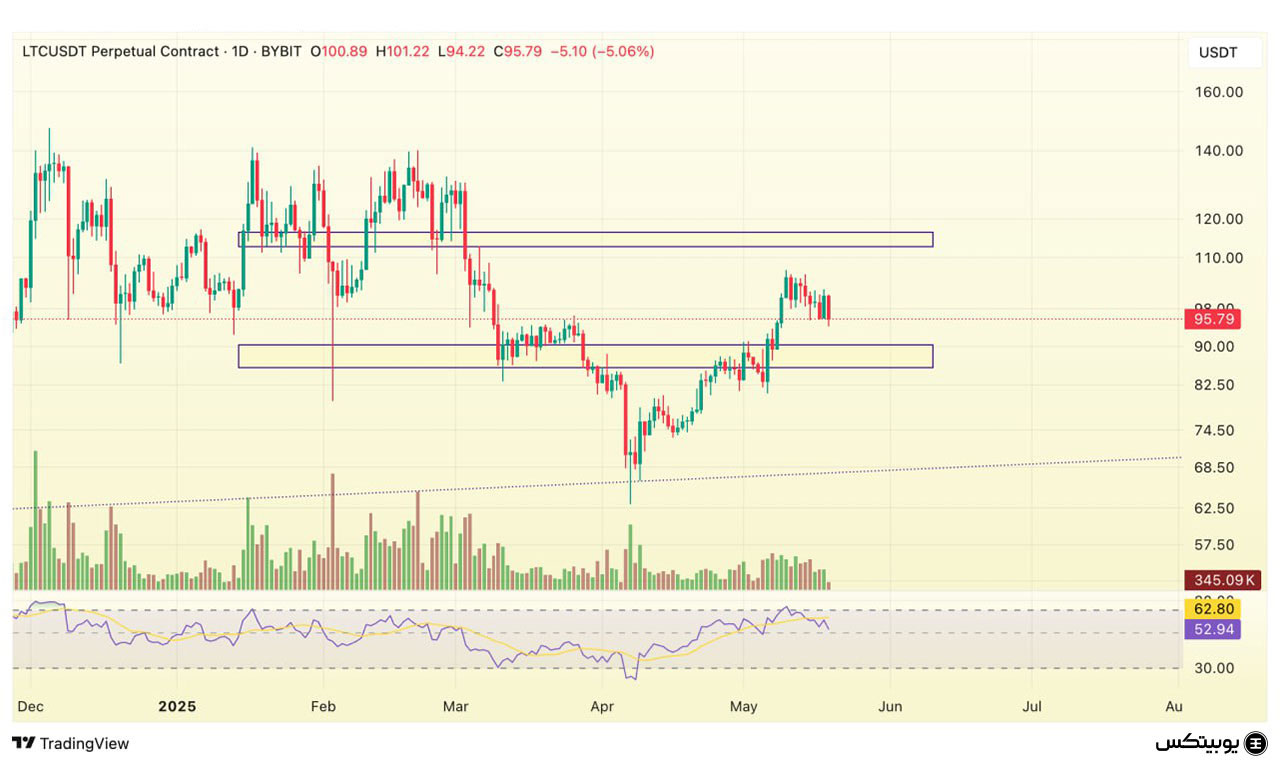 لایت کوین: لایتکوین در محدوده ۸۶ تا ۹۰ دلار دارای حمایت است و تثبیت بالای این سطح میتواند از ریزش بیشتر جلوگیری کند. مقاومت مهم آن در محدوده ۱۱۲ تا ۱۱۶ دلار قرار دارد و عبور از این ناحیه میتواند شروع یک موج صعودی جدید باشد.
