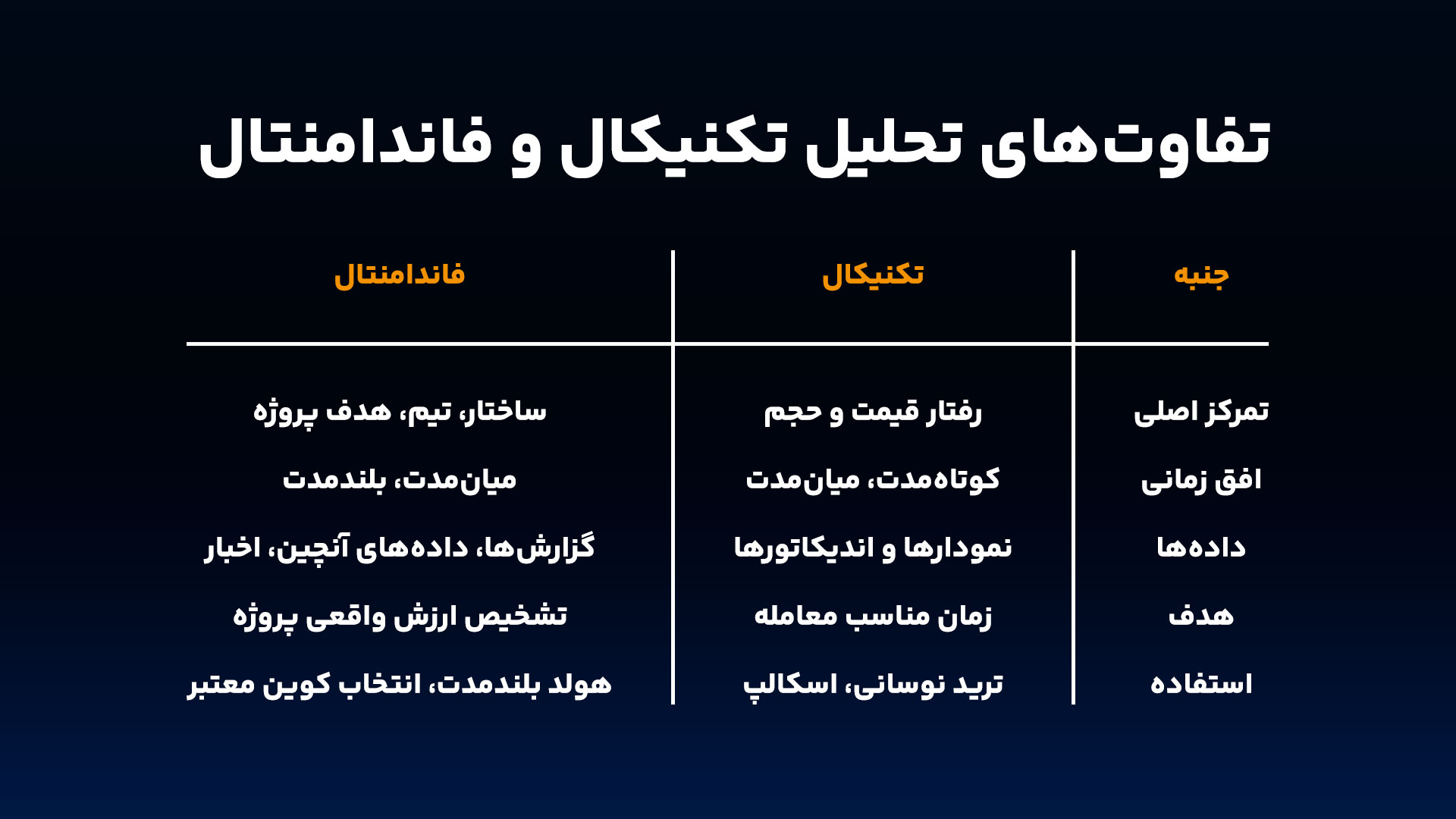 برخلاف بازار سهام که تمرکز تحلیل فاندامنتال روی صورتهای مالی، EPS و نسبت P/E است، در کریپتو ما با پروژههایی طرف هستیم که اغلب شرکت نیستند بلکه شبکهای غیرمتمرکزند. اینجا فاندامنتال یعنی بررسی زیرساختهای پروژه، میزان مقبولیت، اعتبار تیم، کاربرد واقعی و عوامل اقتصادی مرتبط با کوین یا توکن.