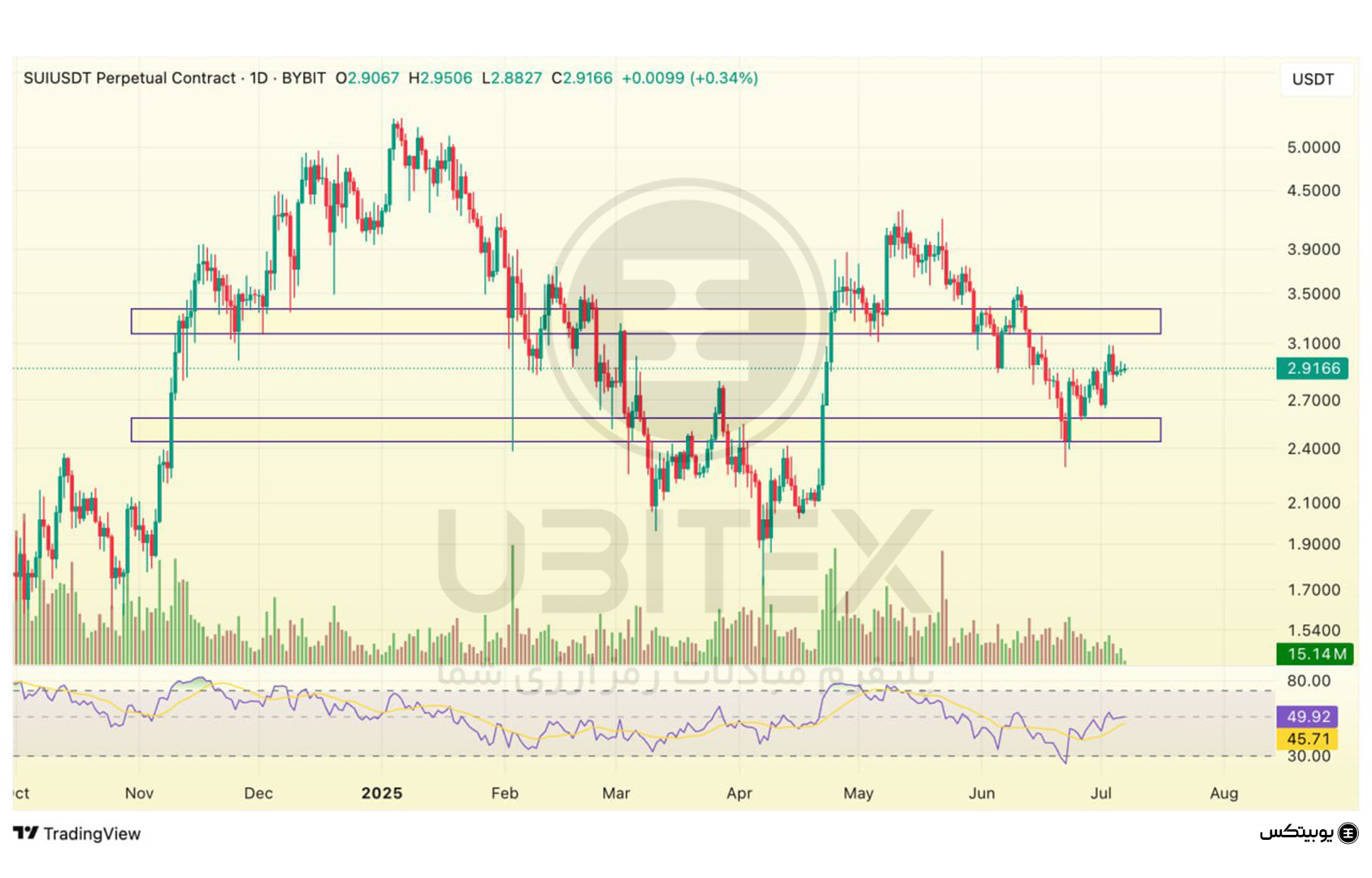 سویی: سویی در محدوده ۲.۴۲ تا ۲.۵۸ دلار از حمایت برخوردار است؛ این سطح میتواند در صورت اصلاح قیمت، بهعنوان نقطه توقف موقت فروشندگان عمل کند. در سوی مقابل، مقاومت آن بین ۳.۱۶ تا ۳.۳۸ دلار قرار دارد و عبور از این ناحیه ممکن است منجر به باز شدن مسیر برای یک حرکت صعودی جدید شود.