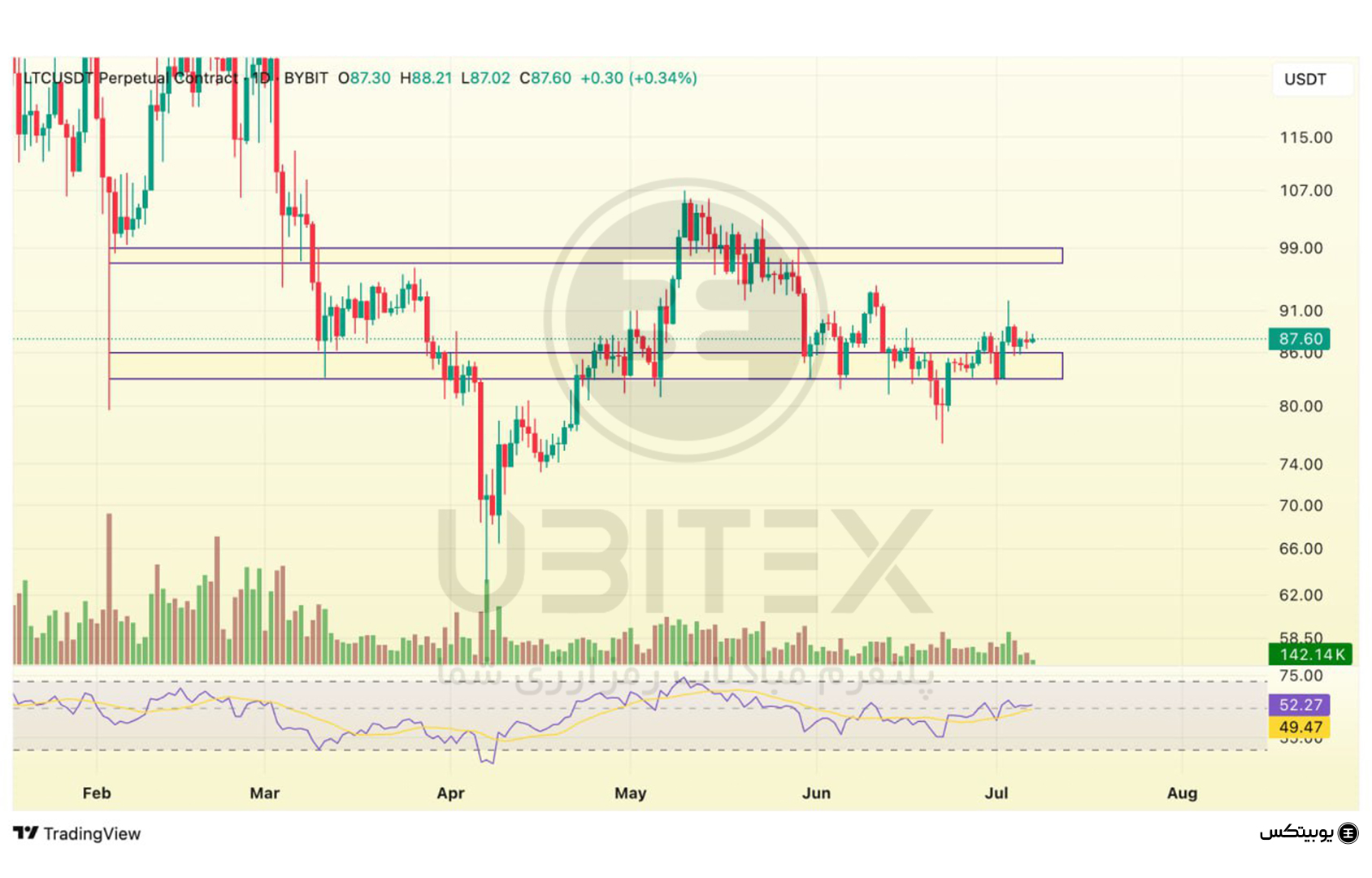 لایت کوین: برای لایت کوین، محدوده ۸۳ تا ۸۶ دلار بهعنوان ناحیه حمایتی شناخته میشود؛ جایی که در گذشته شاهد واکنش مثبت بازار نسبت به آن بودهایم. محدوده مقاومتی نیز بین ۹۷ تا ۹۹ دلار قرار دارد؛ سطحی که ممکن است در کوتاهمدت مانع از ادامه روند صعودی شود مگر اینکه حجم معاملات به شکل محسوسی افزایش یابد.