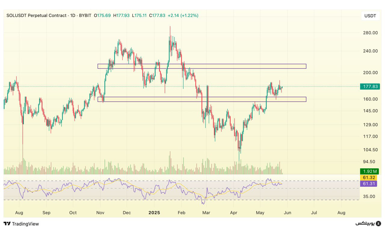 سولانا: سولانا در محدوده ۱۵۶ تا ۱۶۳ دلار حمایت دارد و این سطح میتواند نقش کف قیمتی را ایفا کند. در طرف مقابل، مقاومت مهم سولانا بین ۲۰۷ تا ۲۱۴ دلار قرار گرفته که عبور از آن میتواند نشاندهنده ادامه روند صعودی باشد.