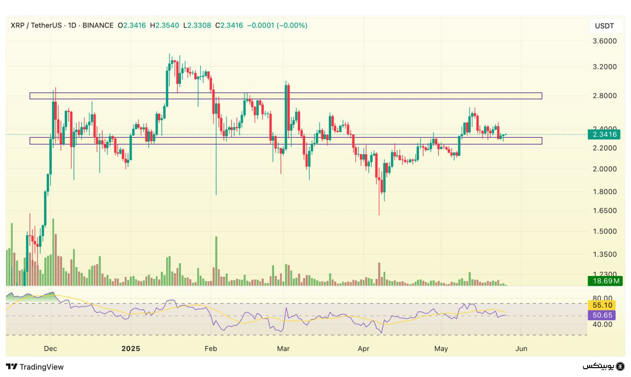 ریپل: ریپل در محدوده ۲.۲ تا ۲.۳ دلار دارای حمایت است و این سطح میتواند مانع ریزش بیشتر شود. مقاومت اصلی در ناحیه ۲.۷ تا ۲.۸ دلار قرار دارد که عبور از آن، نشانهای مثبت برای ادامه روند صعودی خواهد بود.