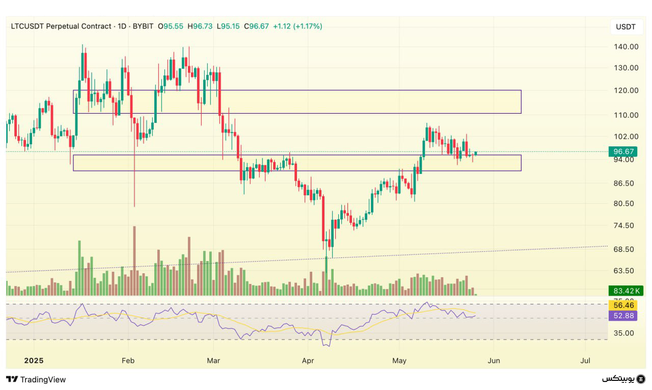 لایت کوین: لایت کوین حمایت خود را در محدوده ۹۰ تا ۹۵ دلار حفظ کرده و مقاومت کلیدی آن بین ۱۱۰ تا ۱۲۰ دلار قرار دارد که شکست این محدوده میتواند روند صعودی را تقویت کند.