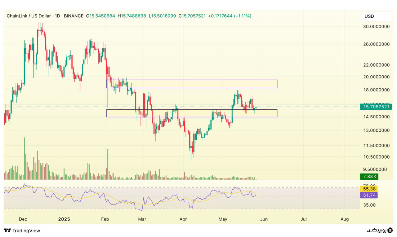 چِین لینک: چینلینک در محدوده ۱۴ تا ۱۵.۵ دلار حمایت دارد و این ناحیه میتواند کف قیمتی فعلی را حفظ کند. مقاومت مهم آن نیز بین ۱۸.۲ تا ۱۹.۵ دلار قرار گرفته که عبور از آن میتواند راه را برای اهداف بالاتر هموار کند.