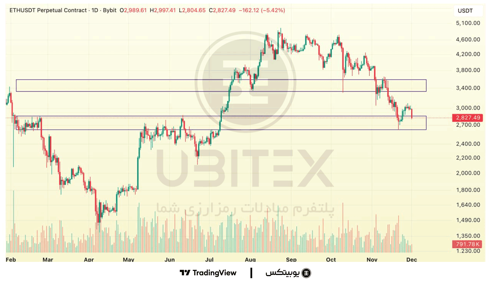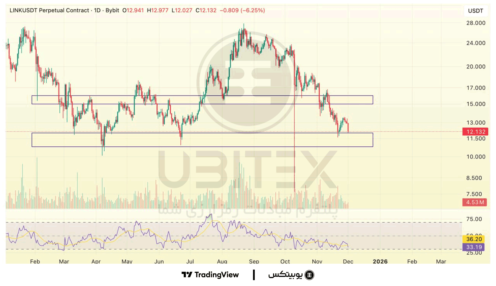 اتریوم: اتریوم میان حمایت ۲۶۰۰–۲۸۰۰ و مقاومت ۳۳۰۰–۳۶۰۰ نوسان میکند و حرکت فعلی بیشتر حالت پولبک در روند نزولی دارد. حفظ حمایت ۲۶۰۰–۲۸۰۰ میتواند بازگشت کوتاهمدت ایجاد کند، اما شکست آن مسیر اصلاح عمیقتر را فعال میکند.