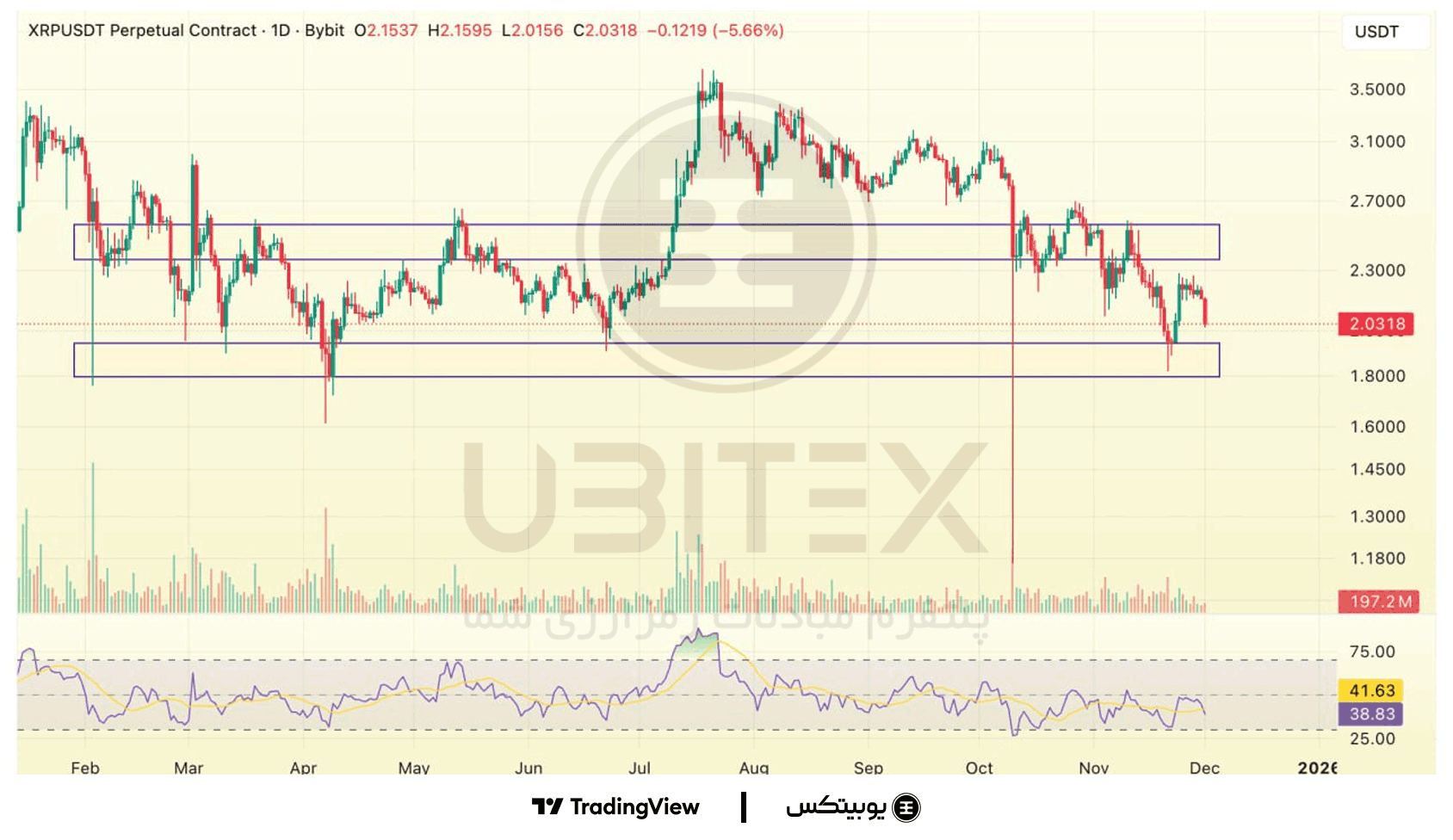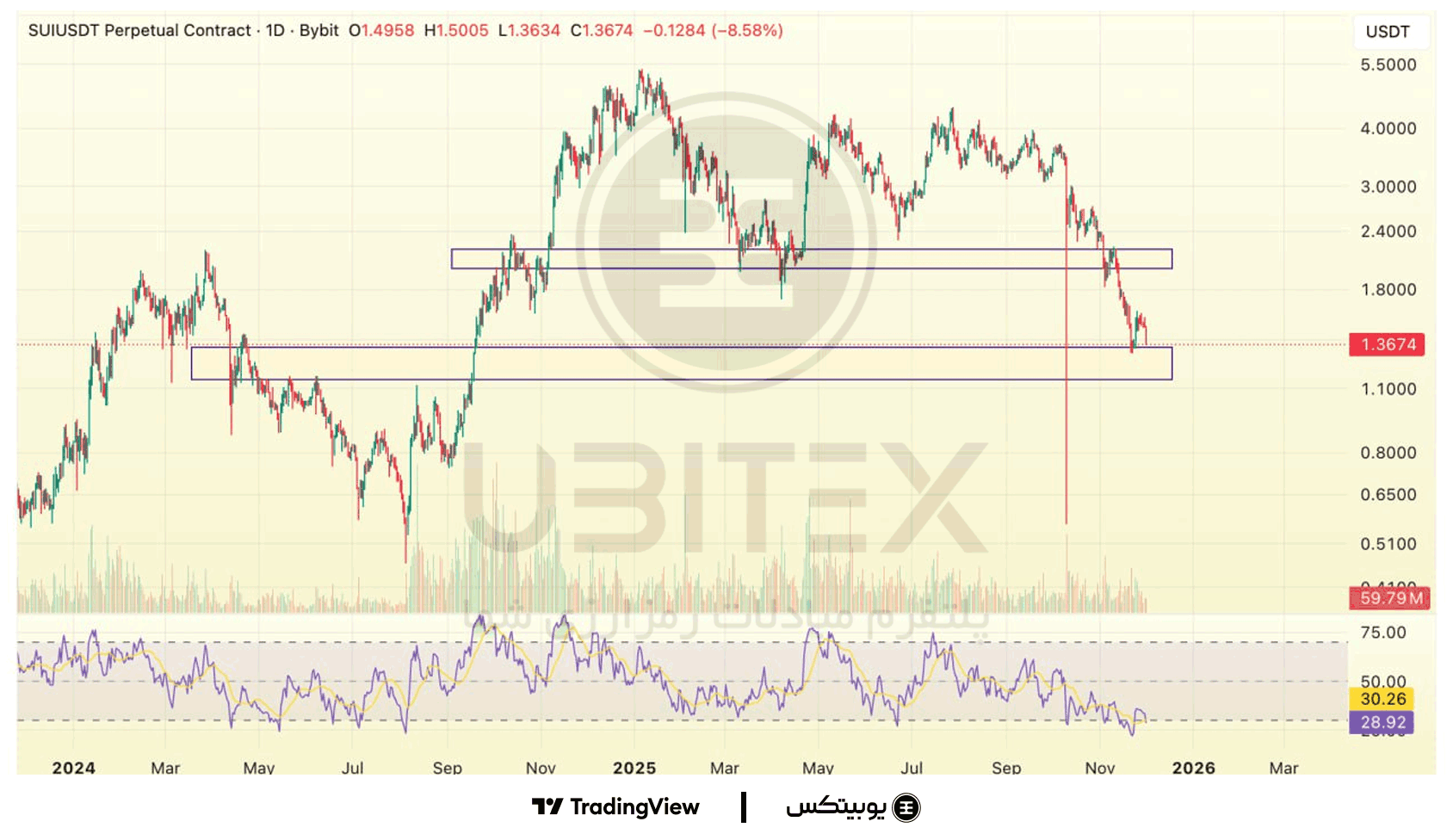 سویی: سویی روی حمایت ۱.۱۵–۱.۳۵ قرار دارد و واکنشهای فعلی بیشتر تلاش برای حفظ کف ساختاری است. در صورت حفظ این ناحیه احتمال بازگشت تا ۲–۲.۲ وجود دارد، اما شکست ۱.۱۵ مسیر نزولی جدیدی را فعال میکند.