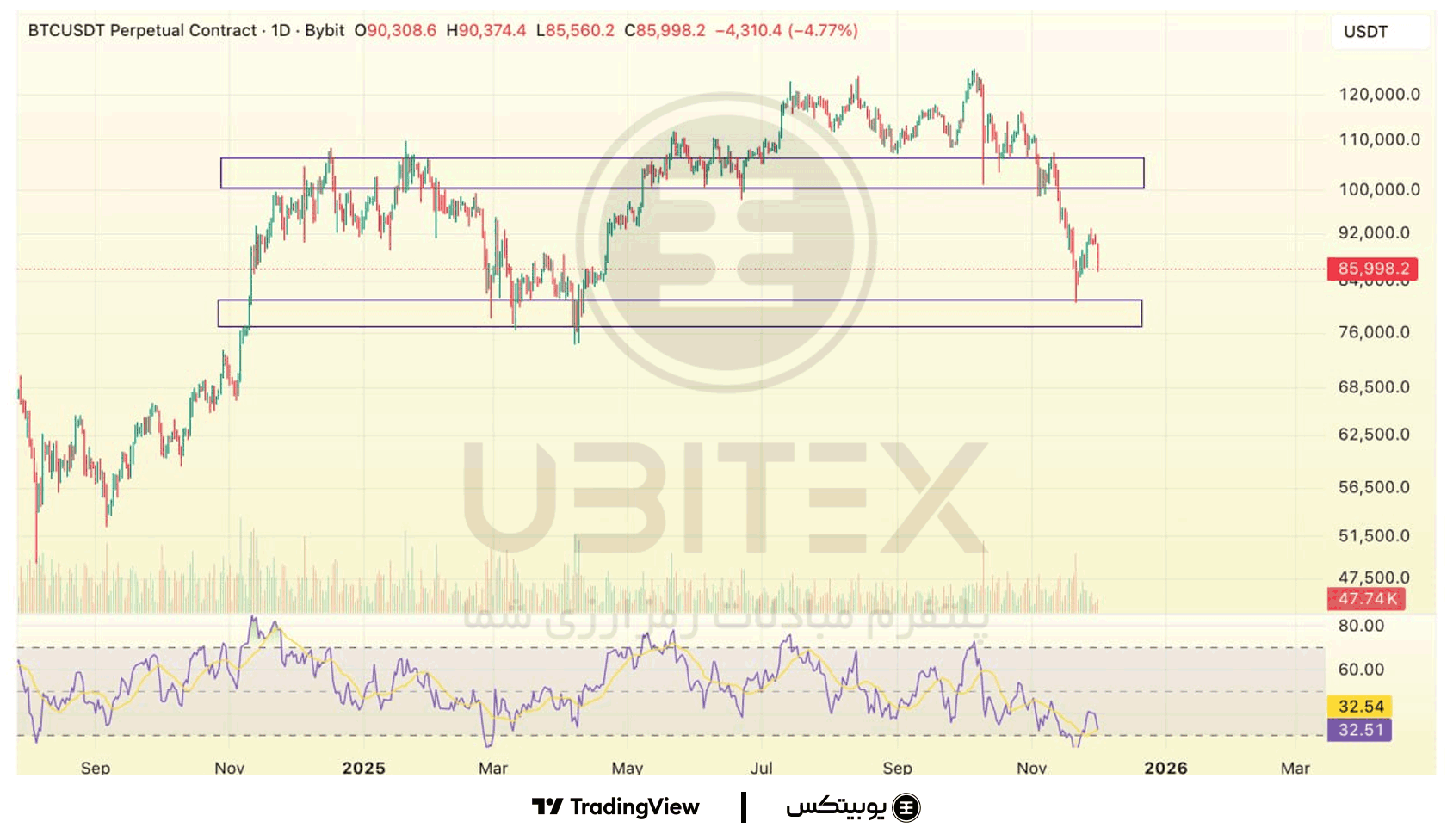 بیتکوین: بیتکوین بین حمایت ۷۷–۸۱ هزار و مقاومت ۱۰۴–۱۰۶ هزار نوسان میکند و فعلاً ساختار کوتاهمدت تحت فشار نزولی است. حفظ ناحیهی حمایتی ۷۷–۸۱ هزار میتواند آغاز بازیابی باشد، اما از دست رفتن آن ریسک اصلاح عمیقتر را فعال میکند.