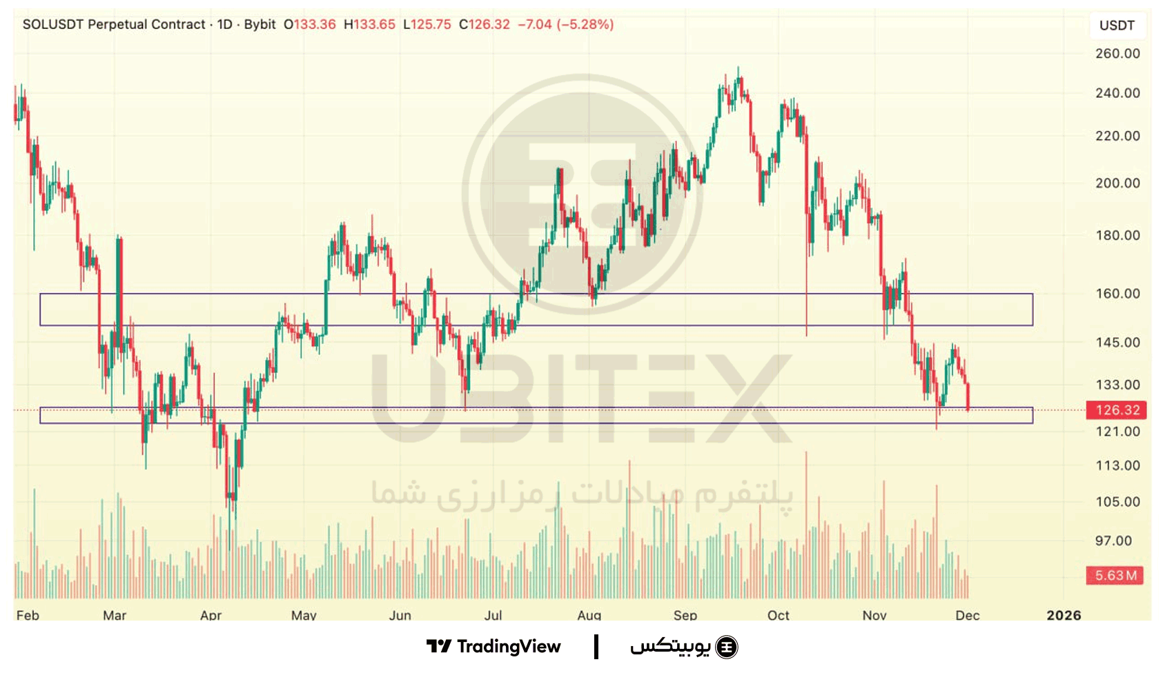 سولانا: سولانا دقیقاً روی حمایت ۱۲۳–۱۲۷ در حال نوسان است و واکنشهای فعلی بیشتر حالت تلاش برای حفظ کف دارد. تا زمانی که این محدوده حفظ شود شانس بازگشت تا ۱۵۰–۱۶۰ وجود دارد، اما از دست رفتن ۱۲۳ ساختار را کاملاً نزولی میکند.